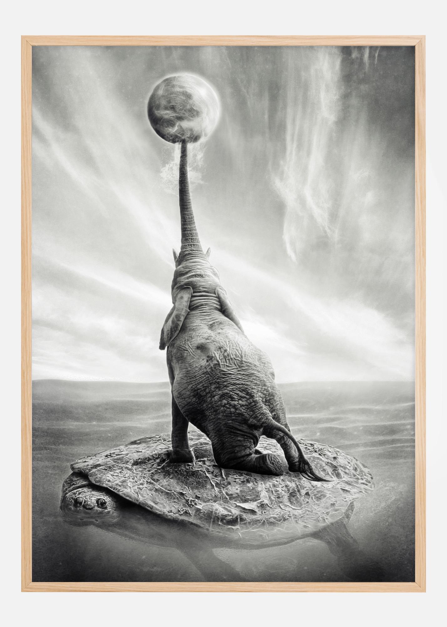 Cette fascinante poster en noir et blanc capture une image surréaliste d'un éléphant se tenant sur une tortue et équilibrant un globe sur sa trompe. L'image dégage une symbolique puissante et joue avec des éléments de mythologie et de fantaisie. La peau texturée de l'éléphant et de la tortue, détaillée et proéminente, ajoute une dimension presque tactile à l'œuvre, tandis que l'arrière-plan flou de nuages et de paysages contribue à une atmosphère onirique et éthérée.