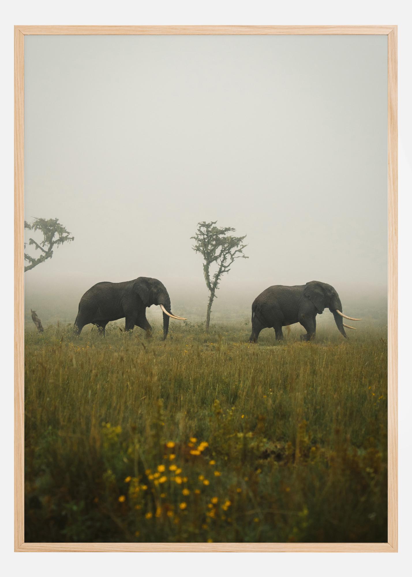 Une photographie de nature d'un couple d'éléphants errant dans les hautes herbes entre des arbres arides. Le brouillard dense en arrière-plan crée des contrastes marqués qui mettent particulièrement en valeur les grands animaux. Un poster pour ceux qui aiment la savane et ses plus grands habitants !