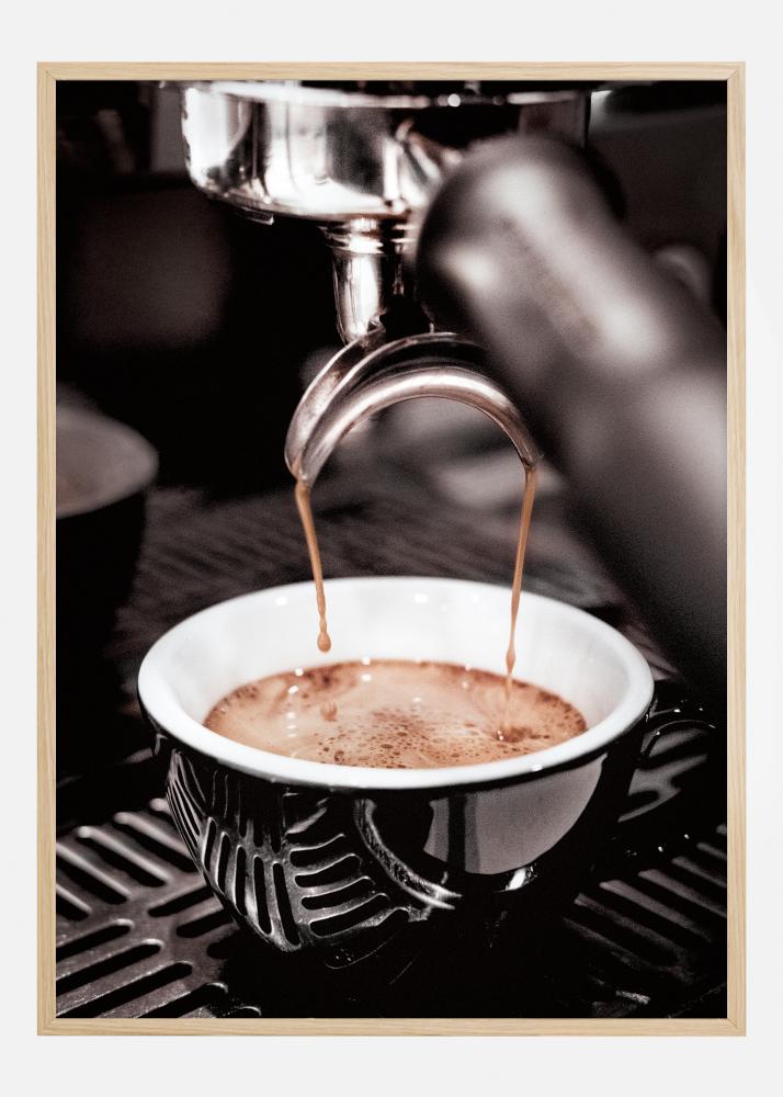 Cette affiche capture un moment presque sensuel d'un espresso brassé à la perfection, où les gouttes dorées de café rencontrent la tasse blanche en porcelaine dans une danse intime. C'est une ode aux amateurs de café et aux connaisseurs, une image qui transmet à la fois l'arôme riche et le goût fort qu'offre l'espresso. Le focus sélectif sur le flux de café et la tasse en dessous, contre l'arrière-plan flou de la machine à espresso, crée un effet qui permet au spectateur de presque sentir la chaleur et d'entendre le sifflement de la vapeur.