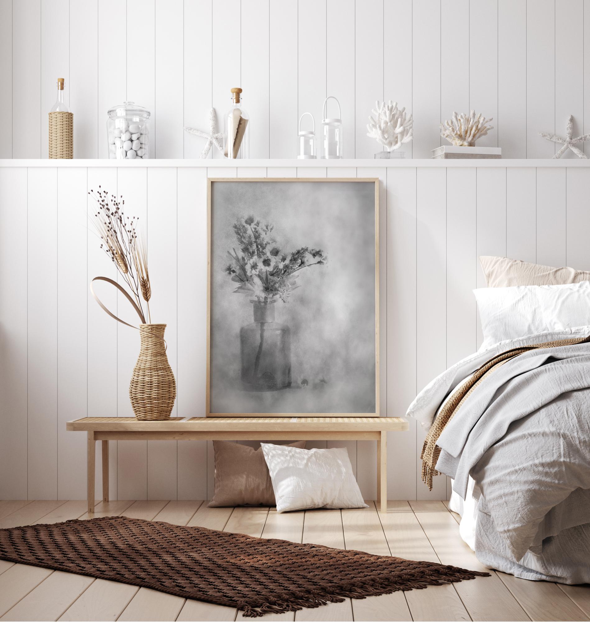 Une affiche romantique avec cette nature morte d’un vase et de fleurs. Cette œuvre dans les tons gris a une douce sensation de peinture avec un contraste minimal entre les différents éléments de l'image. Imaginez que vous vous installez pour peindre cette scène tranquille sur un mur pastel de votre foyer.