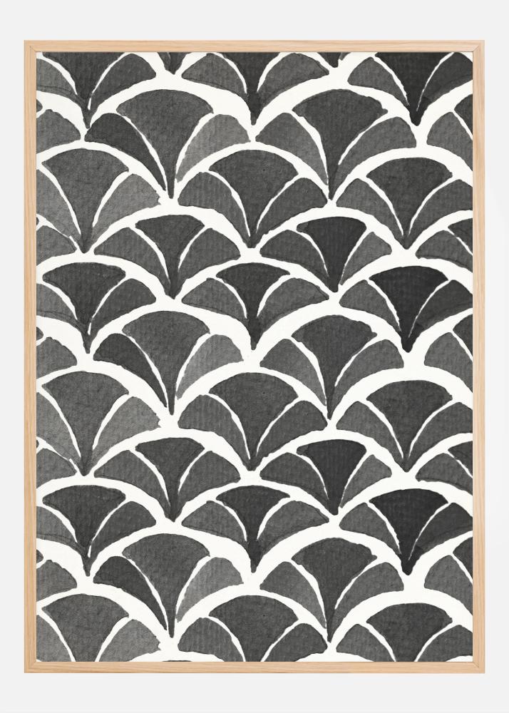 Apportez une touche d'élégance artistique à votre espace avec cette affiche qui présente un motif captivant de plumes en noir et blanc. Cette impression présente un motif répétitif rappelant des éventails vintage, disposés de manière rythmique sur toute la surface pour créer une sensation de mouvement et de symétrie. Le contraste élégant entre le noir et le blanc offre un look classique qui s'intègre dans de nombreux styles d'intérieur et environnements différents.