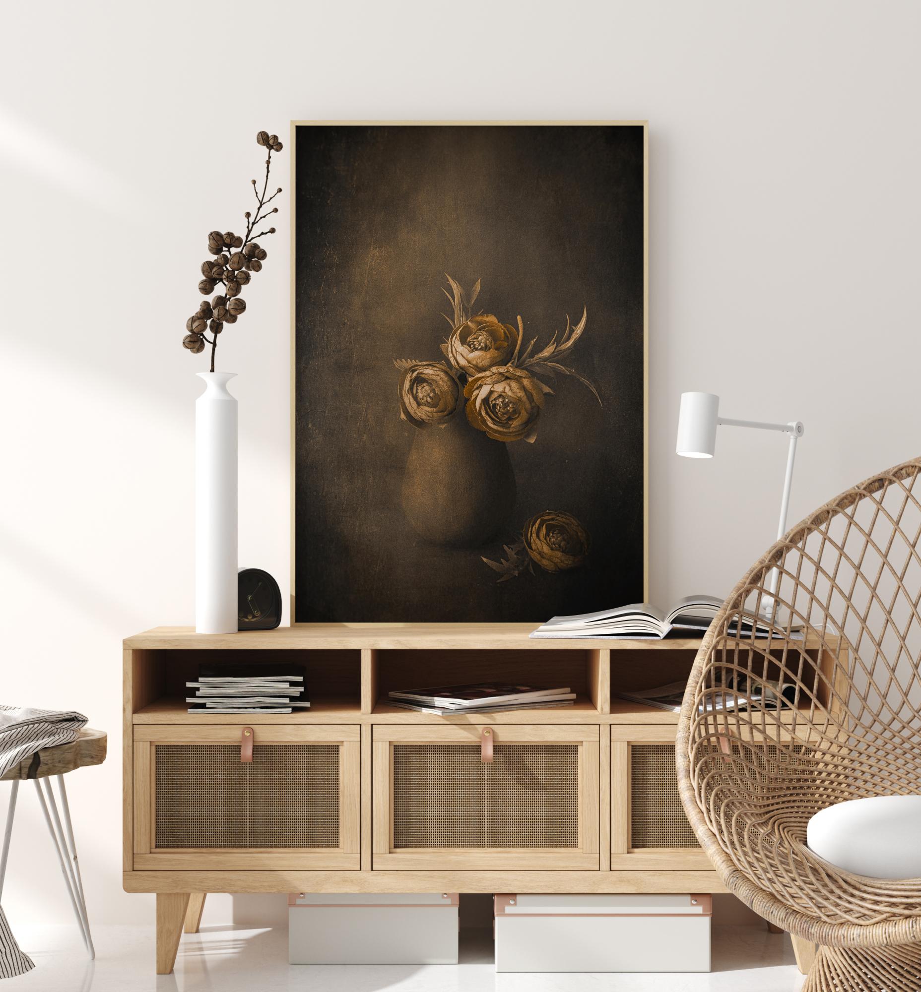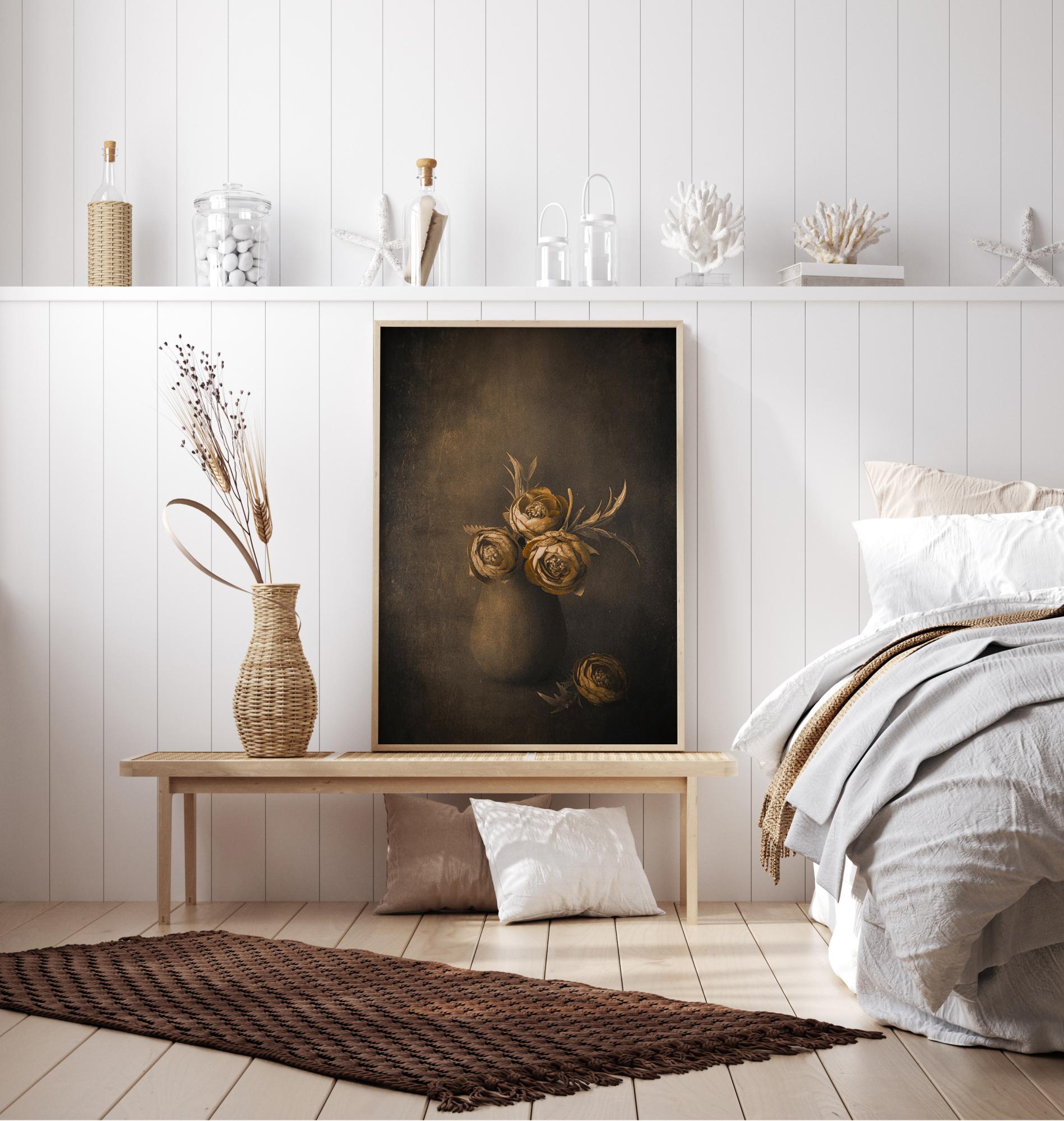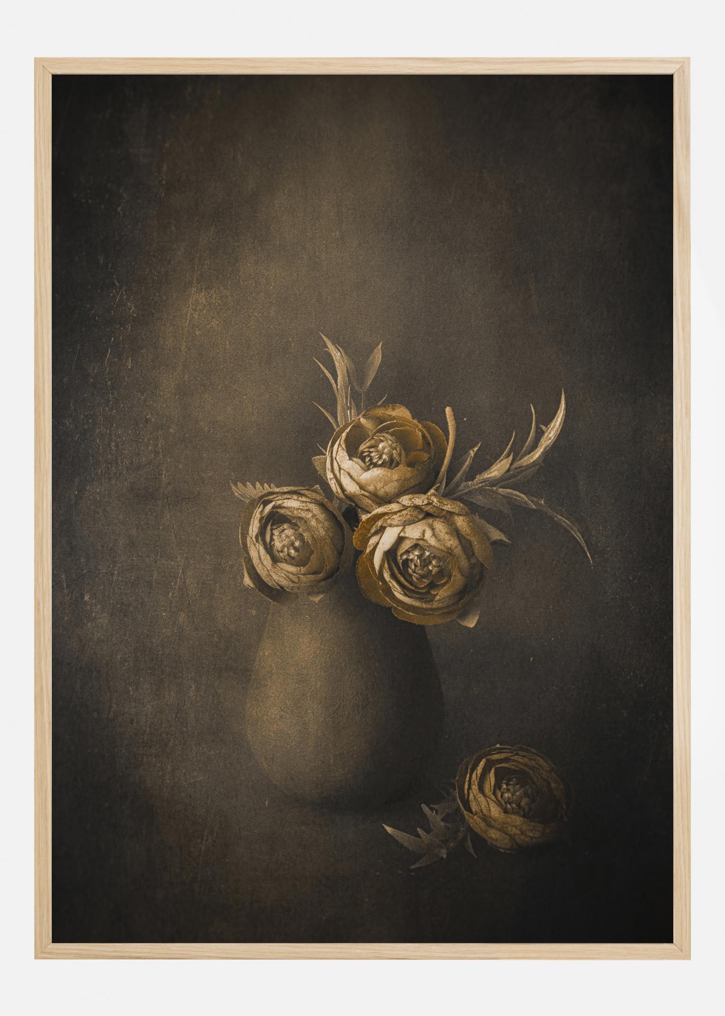 Poster d'une nature morte de fleurs dorées dans une jarre en terre sur un fond sombre. Les fleurs dorées et jaunes chatoyantes se détachent du brun plus foncé du mur dans la peinture. Associez cette affiche à un fond crème pour mettre ses fleurs en valeur.