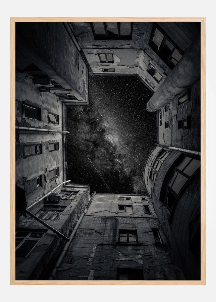 Le print combine la beauté architecturale de la ville avec la beauté naturelle du cosmique, créant un contraste suggestif entre l'urbain et l'universel. Le schéma de couleurs monochrome avec ses nuances de noir, blanc et gris rend l'image facile à intégrer dans différents styles de décoration et elle serait un sujet de conversation intéressant dans n'importe quelle pièce.