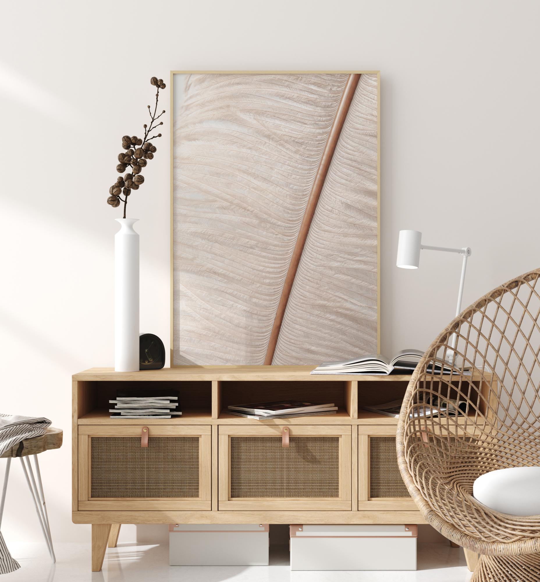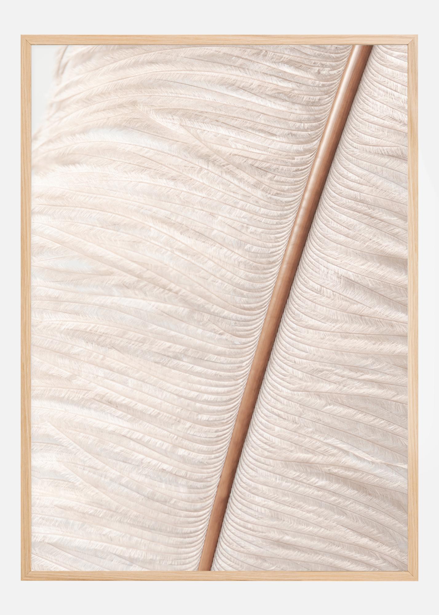 Une affiche macro de la nervure d'une plume d'autruche. Cette image agrandie montre la forte nervure centrale avec toutes les petites barbes blanches et duveteuses qui s'y ramifient. Les détails de ce poster tout doux sont stupéfiants et impressionnant. Associez-le à un mur neutre pour un effet de douceur.