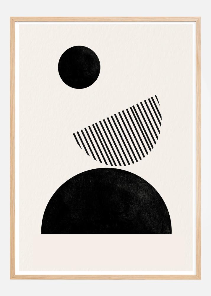 Cet affiche artistique se caractérise par son utilisation ludique des formes géométriques et des textures pour créer une composition équilibrée et moderne. Un grand cercle noir se trouve en haut, suivi d'une demi-cercle à rayures diagonales et d'une demi-forme circulaire noire solide à la base. Chaque élément contribue à une sensation de mouvement et de dynamisme, tandis que les couleurs uniformes créent une impression de cohérence et de simplicité.