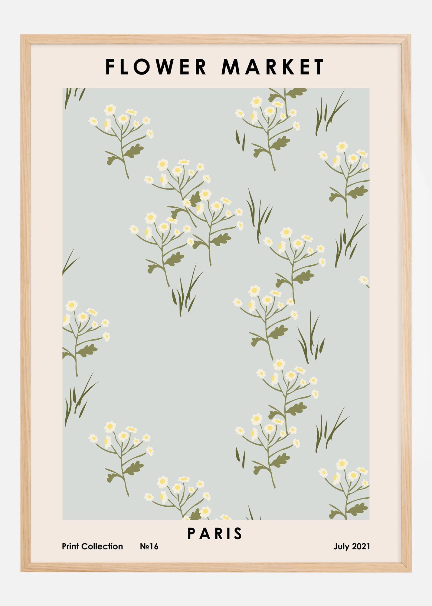 Ce charmant et élégant poster vous transporte directement au cœur de Paris avec son image d'un marché aux fleurs. Il présente un motif de délicates fleurs blanches sur un fond gris-bleu apaisant, offrant une sensation de fraîcheur et d'élégance simple. En haut se trouve le texte "FLOWER MARKET" dans une typographie classique, tandis que le bas contient le texte "Print Collection ?16 PARIS Juillet 2021", ajoutant une sensation d'authenticité et de contexte culturel.