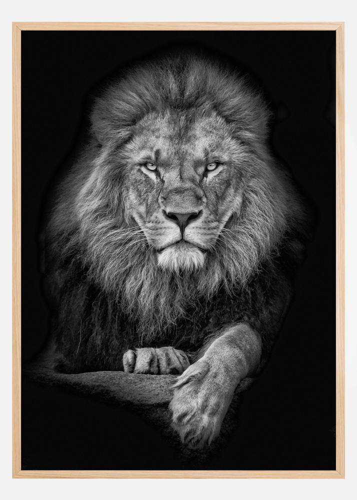 Une photographie en noir et blanc en gros plan d'un lion regardant directement le spectateur. Le fond sombre et le regard intense créent une merveilleuse attraction pour la toile. C'est un poster qui se suffit à lui-même ou qui peut être combiné avec d'autres favoris dans un plus grand collage.
