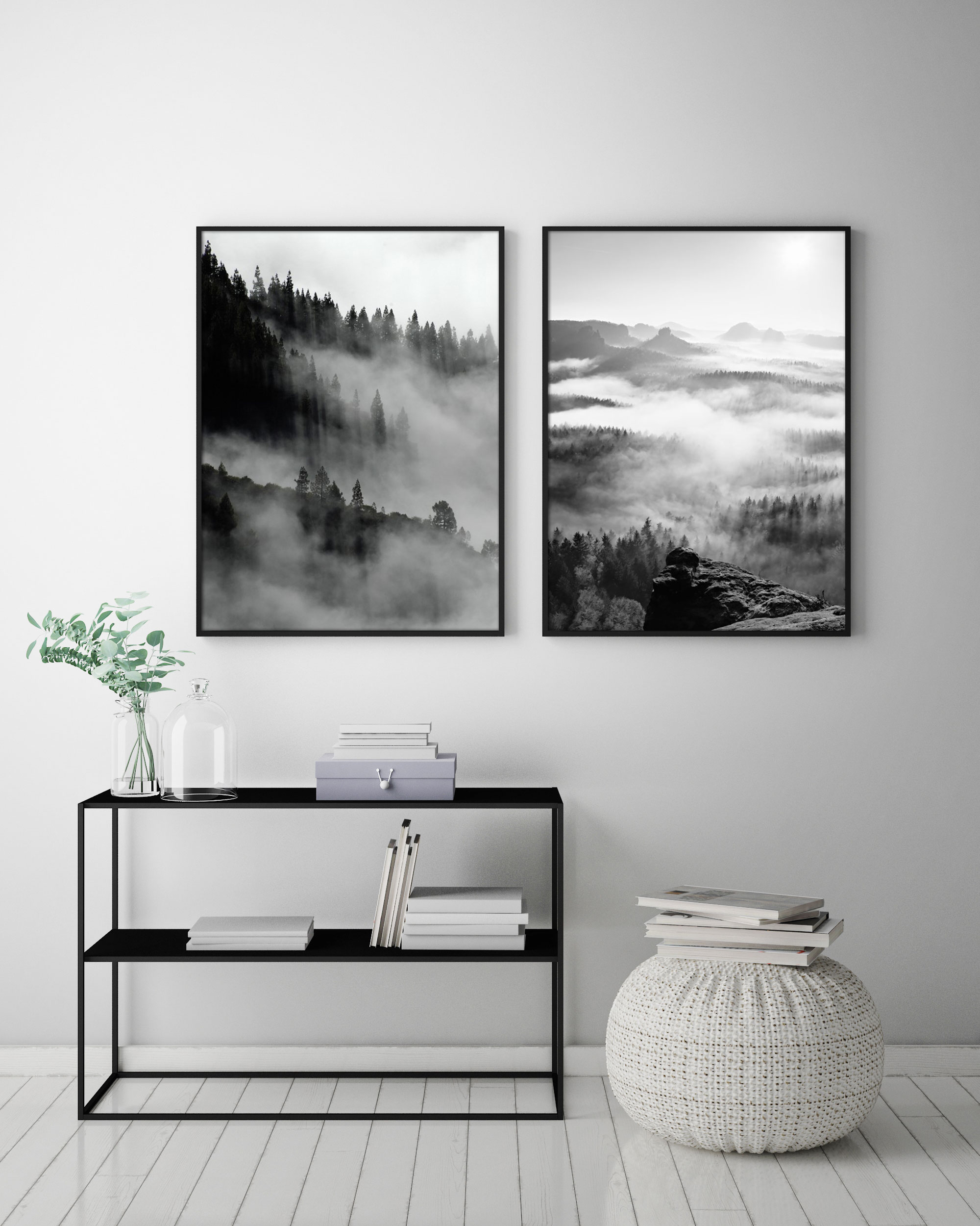 Photographie en noir et blanc avec un paysage montagneux couvert de sapins enveloppé dans le brouillard comme sujet. La profondeur de perspective de l'image, avec le point de vue élevé au-dessus des arbres, donne aux prints un sentiment dramatique. La photographie convient aussi bien à être accrochée à la maison que dans un environnement public, elle s'adapte bien à tous les types de styles d'intérieur. Complétez avec un cadre photo élégant qui met en valeur le sujet de manière appropriée et qui correspond au reste de la décoration de la pièce où le tableau sera accroché.