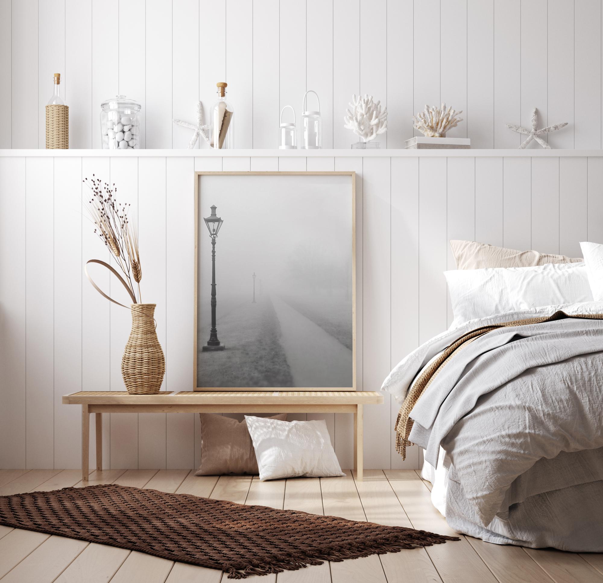 Une affiche urbaine d'une rue brumeuse. Des lampes au style ancien bordent un chemin qui disparaît dans le brouillard au loin. Un calme inquiétant plane sur cette photo subtile qui apporte également un peu de fraîcheur hivernale. Préservez l'ambiance de cette photo en l'accrochant sur un mur blanc.