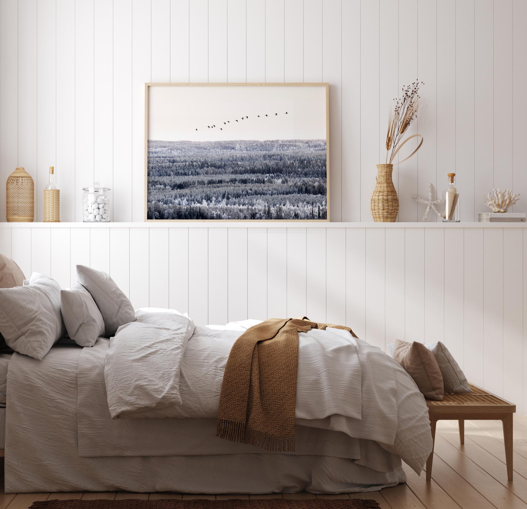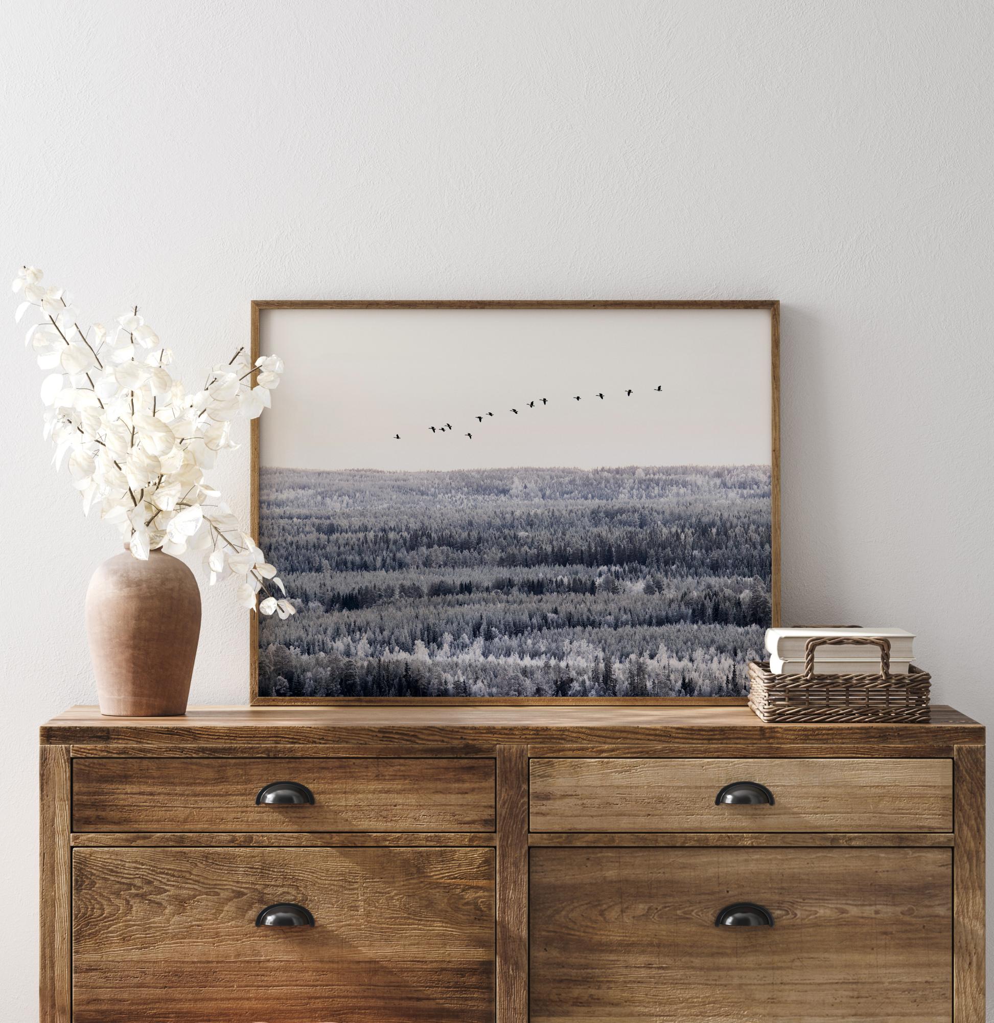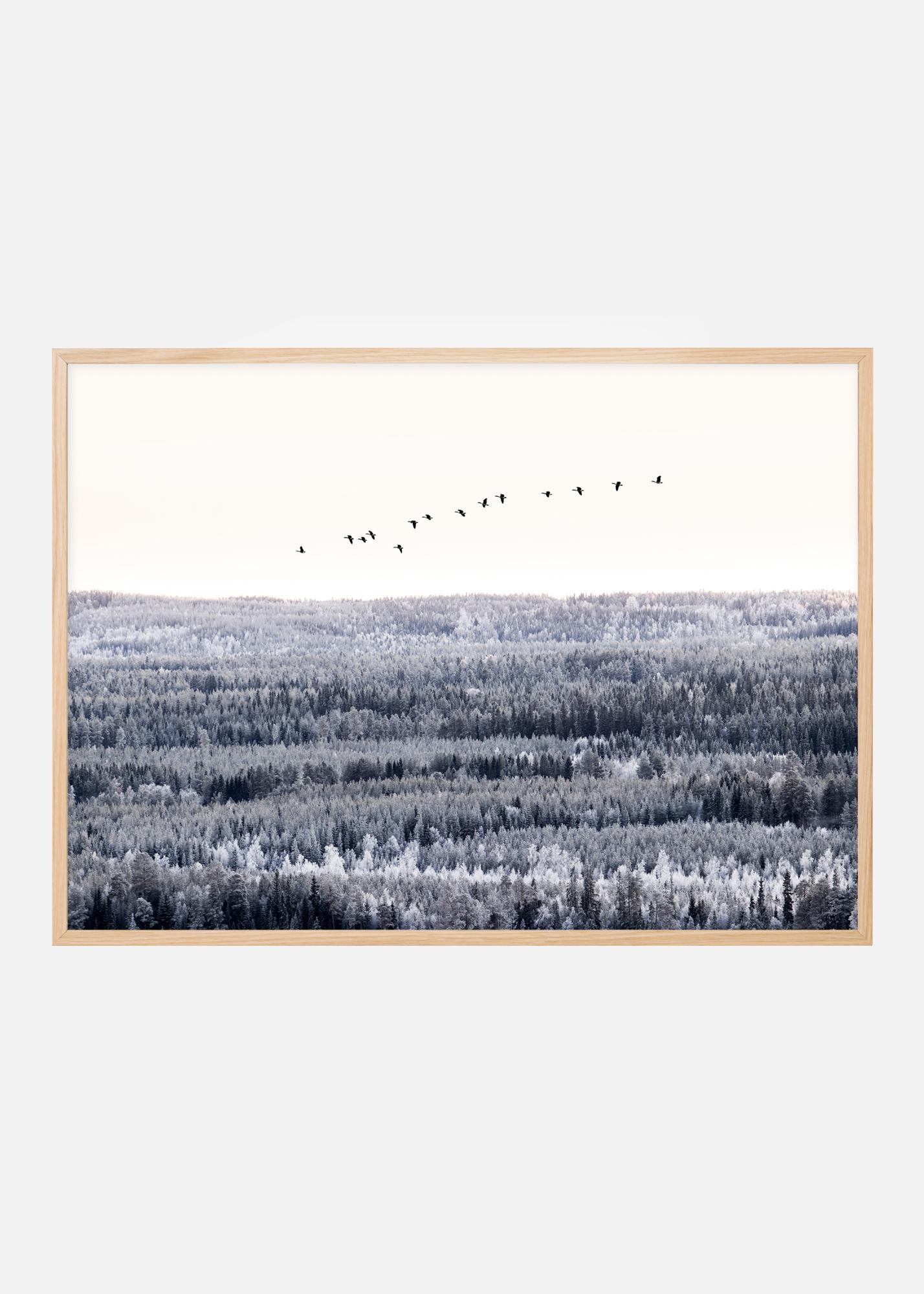 Un poster photographique d'un vol d'oiseaux migrateurs volant haut au-dessus des cimes des arbres. La forêt étendue se décline en tons froids sous un ciel blanc. Un poster qui respire une merveilleuse sensation de liberté.
