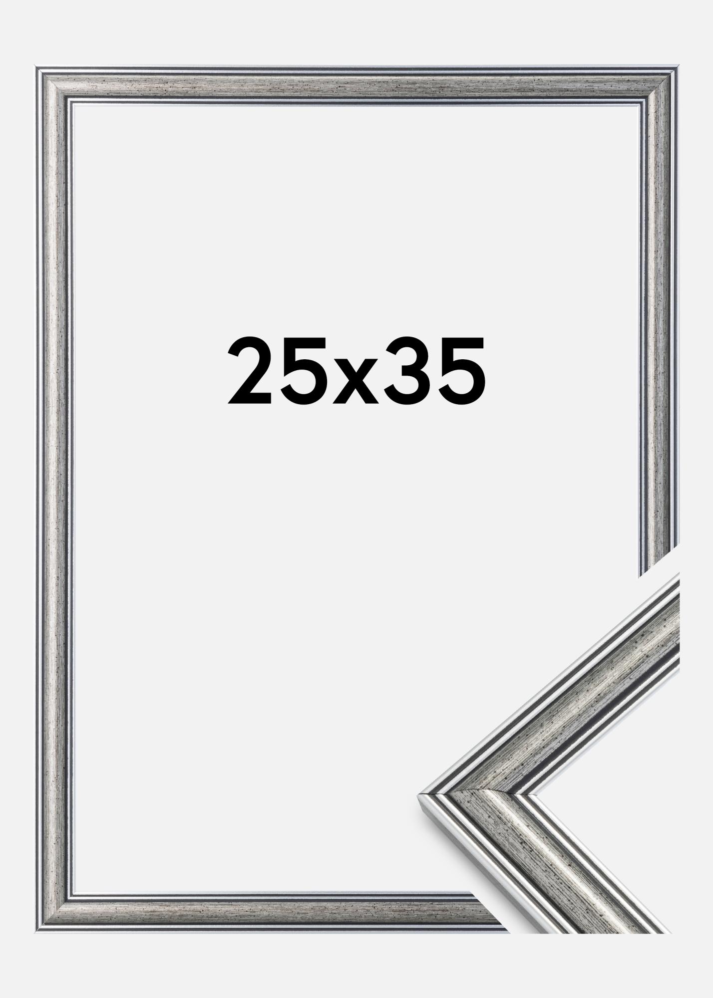 Frigg est un cadre argenté avec des lignes noires et des éléments tachetés en noir. Parfait lorsque vous recherchez un large cadre argenté traditionnel qui convient à de nombreux types d'images et de décorations.