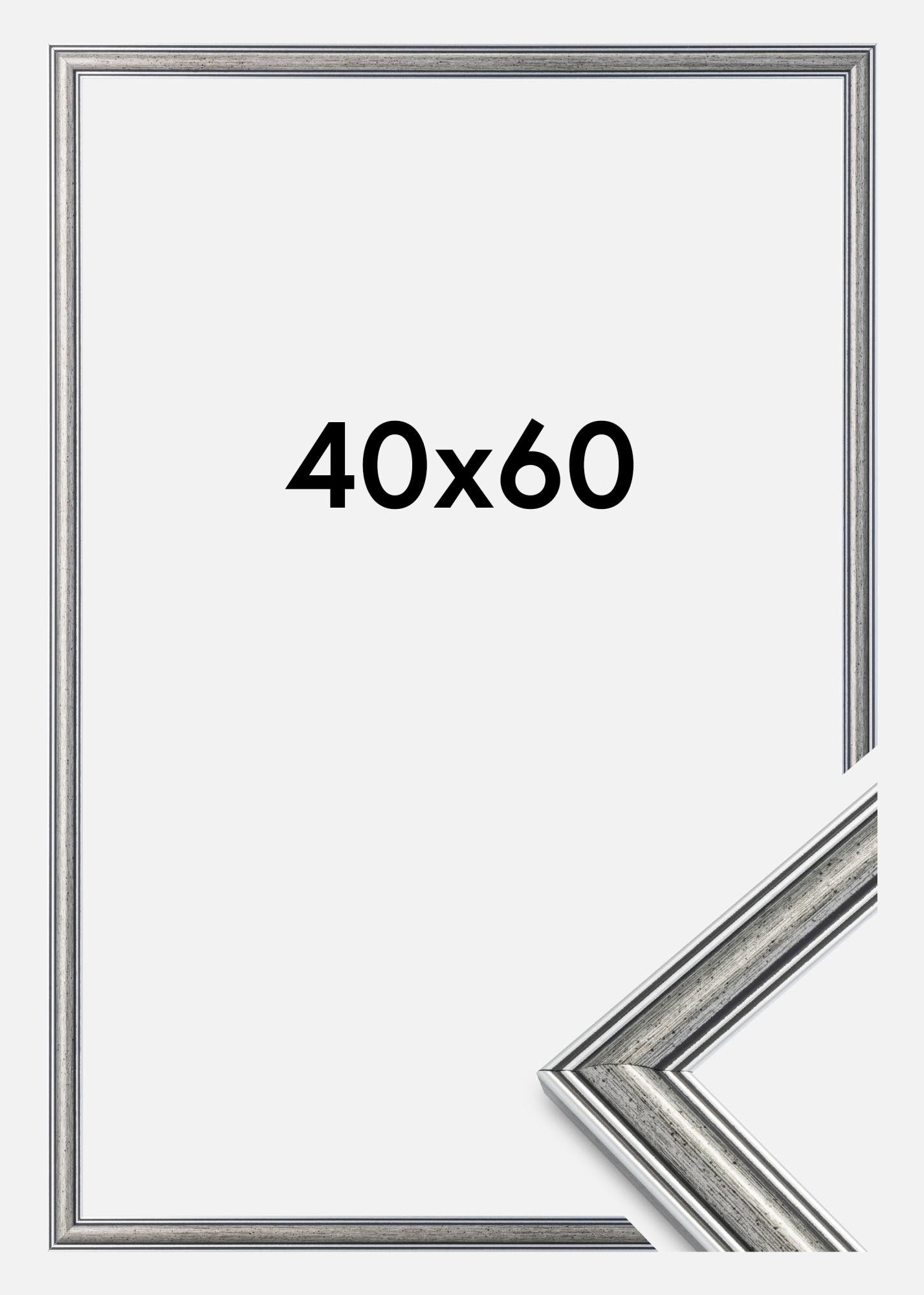 Frigg est un cadre argenté avec des lignes noires et des éléments tachetés en noir. Parfait lorsque vous recherchez un large cadre argenté traditionnel qui convient à de nombreux types d'images et de décorations.