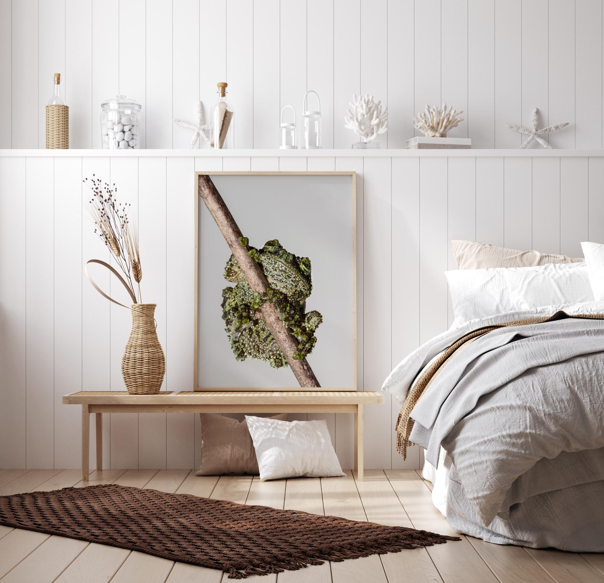 Une affiche macro d'une grenouille sur un arbre contre un ciel bleu pâle. On peut voir les détails de toutes les aspérités et glands de la grenouille qui s'accroche à la fine branche. Ses yeux et sa bouche se détachent de cette image mignonne et attachante qui trouvera sa place sur n'importe quel mur.