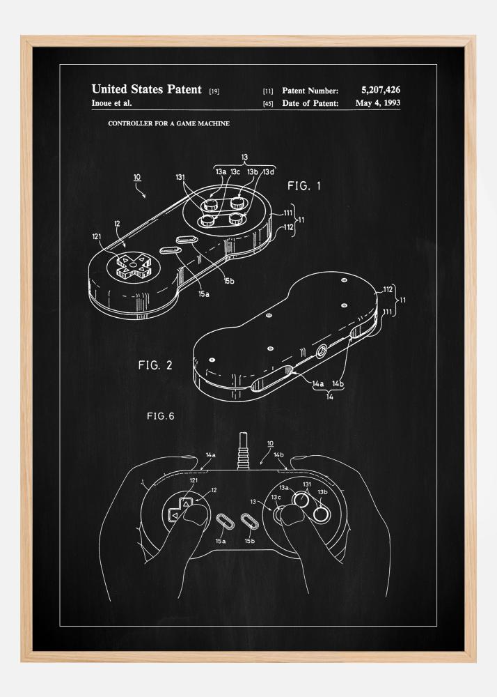 Cette affiche de brevet met en avant un design classique d'une manette de jeu pour une Nintendo, numéro de brevet 5,207,426, daté du 4 mai 1993, sur un élégant fond de tableau noir. Le dessin de brevet montre différentes vues de la manette, y compris le dessus, le dessous et la perspective de l'utilisateur, décrivant en détail la conception des boutons et des manettes qui sont devenues centrales dans l'interaction des joueurs avec les mondes des jeux numériques.