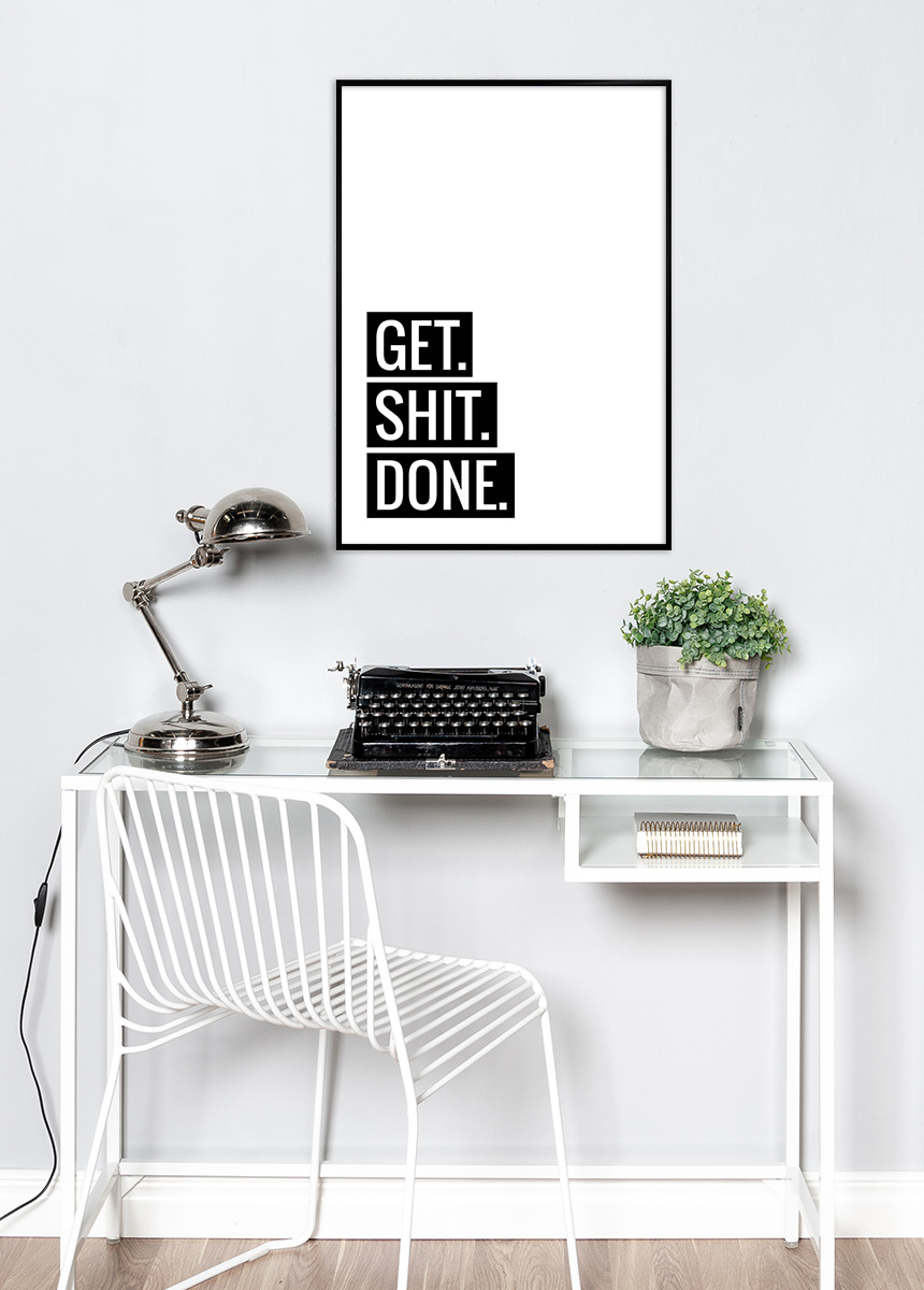 Décorez vos murs avec des appels directs et audacieux ! Cette affiche élégante est en blanc et comporte une impression noir et blanc avec le texte « GET. SHIT. DONE ». Ça ne devrait pas être plus compliqué ! Le design épuré se combine avantageusement avec vos couleurs préférées pour le cadre, le passe-partout et divers composants de décoration. Posez-la sur votre bureau ou accrochez-la au-dessus du canapé ! Comme le poster est disponible en 6 formats différents, vous pouvez l'adapter où vous le souhaitez.