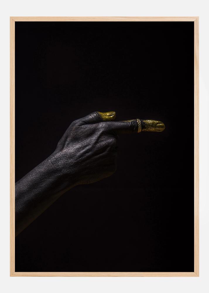 Affiche artistique d'une main pointant un doigt comme un pistolet. La majorité de la main a été peinte en noir, mais les doigts sont recouverts d’or jusqu'à la première articulation. La main pointe comme un pistolet vers la droite de la page, mais se détache sur le fond noir. Ajoutez cette affiche à un mur de couleur crème pour obtenir un effet vraiment spectaculaire.