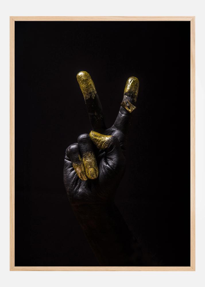 Une affiche pacifiste représentant une main qui se tend pour faire le signe de la paix. La main noire est presque cachée sur le fond noir. Cependant, tous les doigts sont peints en or, de sorte que le V des doigts ressort clairement. Gardez la tête froide en ajoutant ce poster à un mur de votre maison.