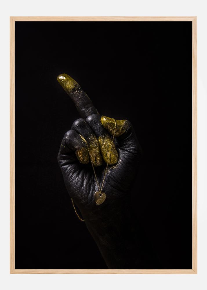 Une affiche spectaculaire d'une main noire avec des doigts dorés pointant vers la gauche. Le poing fermé utilise l'index pour pointer vers quelque chose d'invisible. Autour de la main se trouve un médaillon doré qui tombe élégamment sur les doigts dorés. Associez-la à un mur blanc ou crème pour une déco imposante.