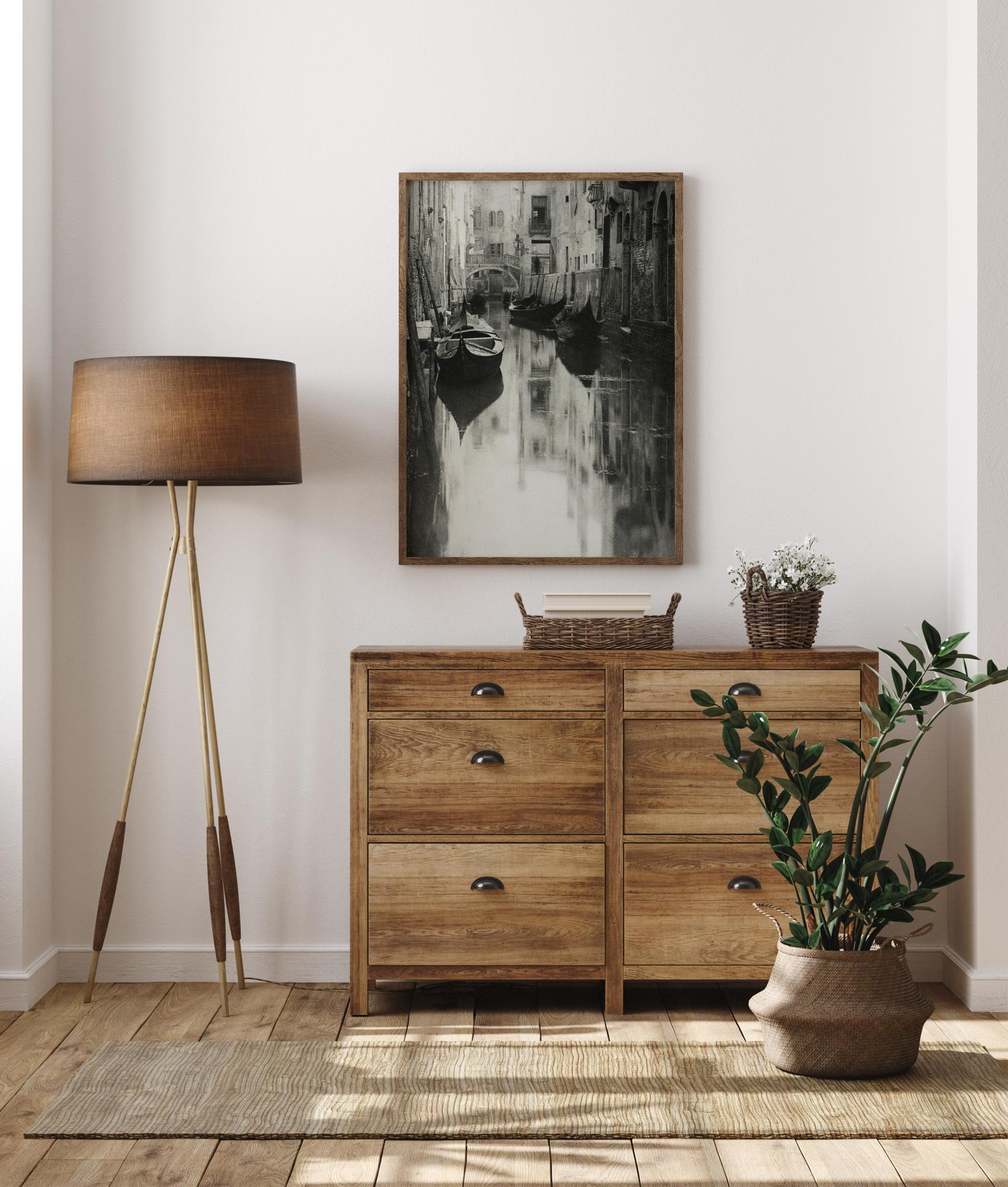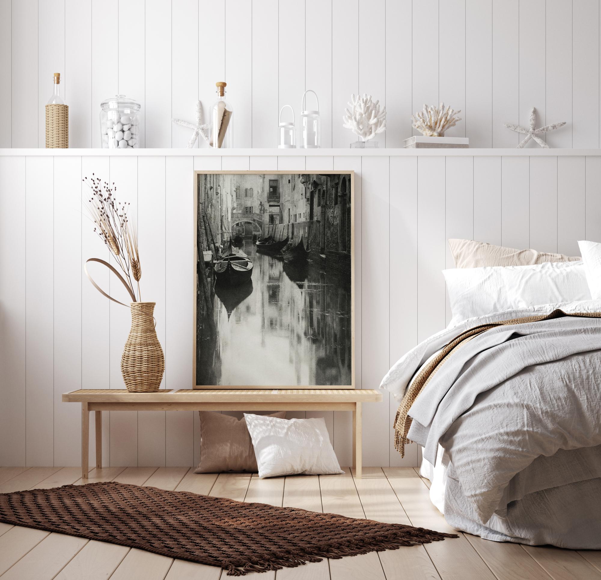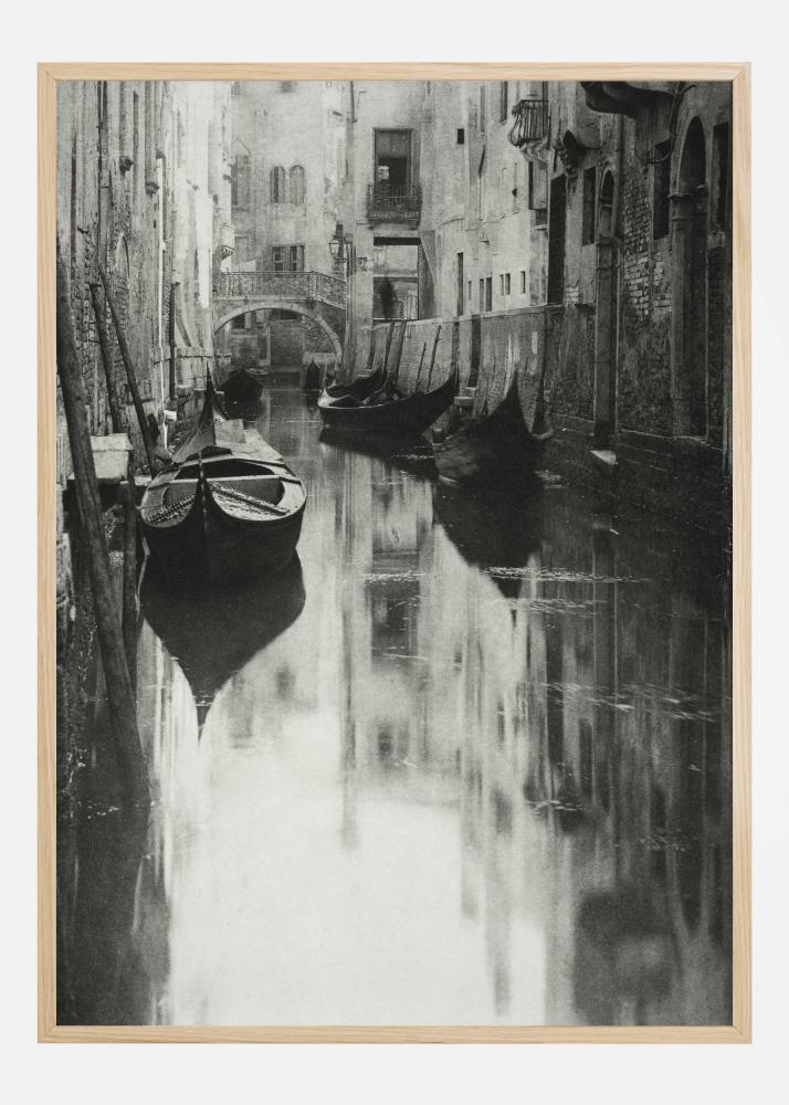Affiche en noir et blanc représentant des gondoles amarrées sur un canal à Venise. Les bateaux sont immobiles sur l'eau tranquille, à côté des maisons aux façades abruptes. La photo respire la paix et le calme dans ce coin perdu de la ville.