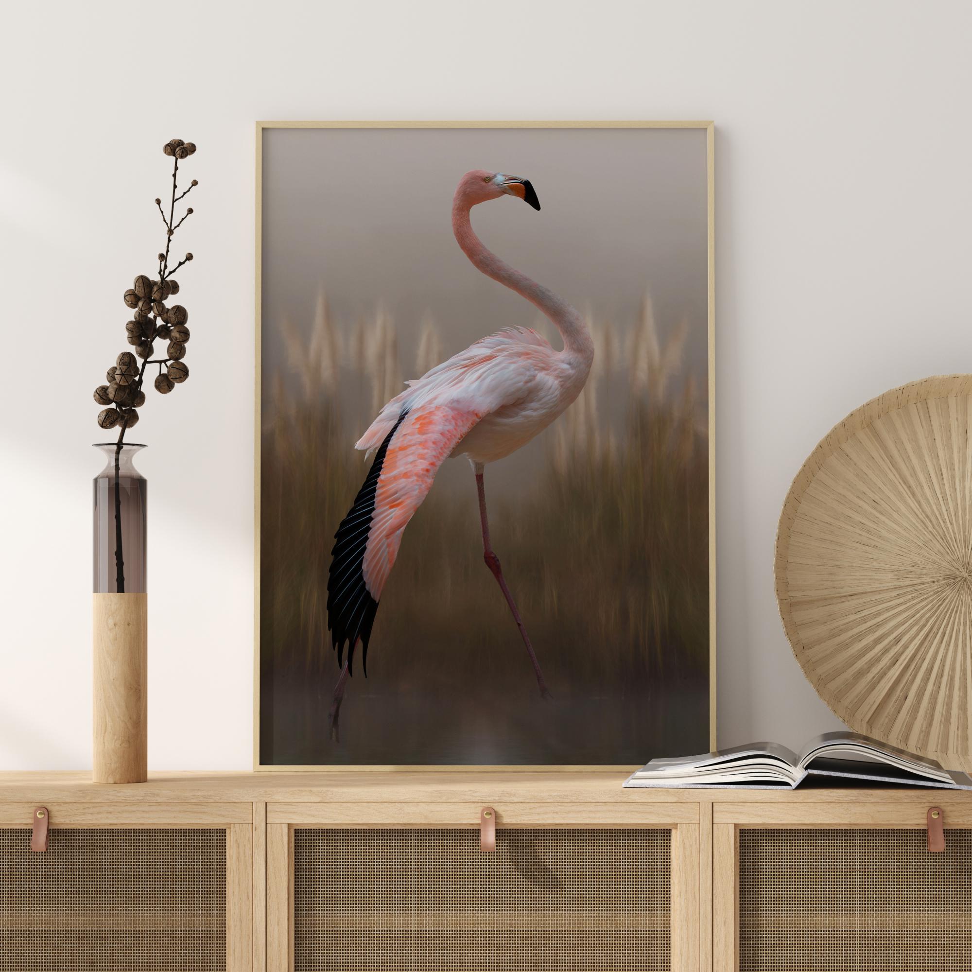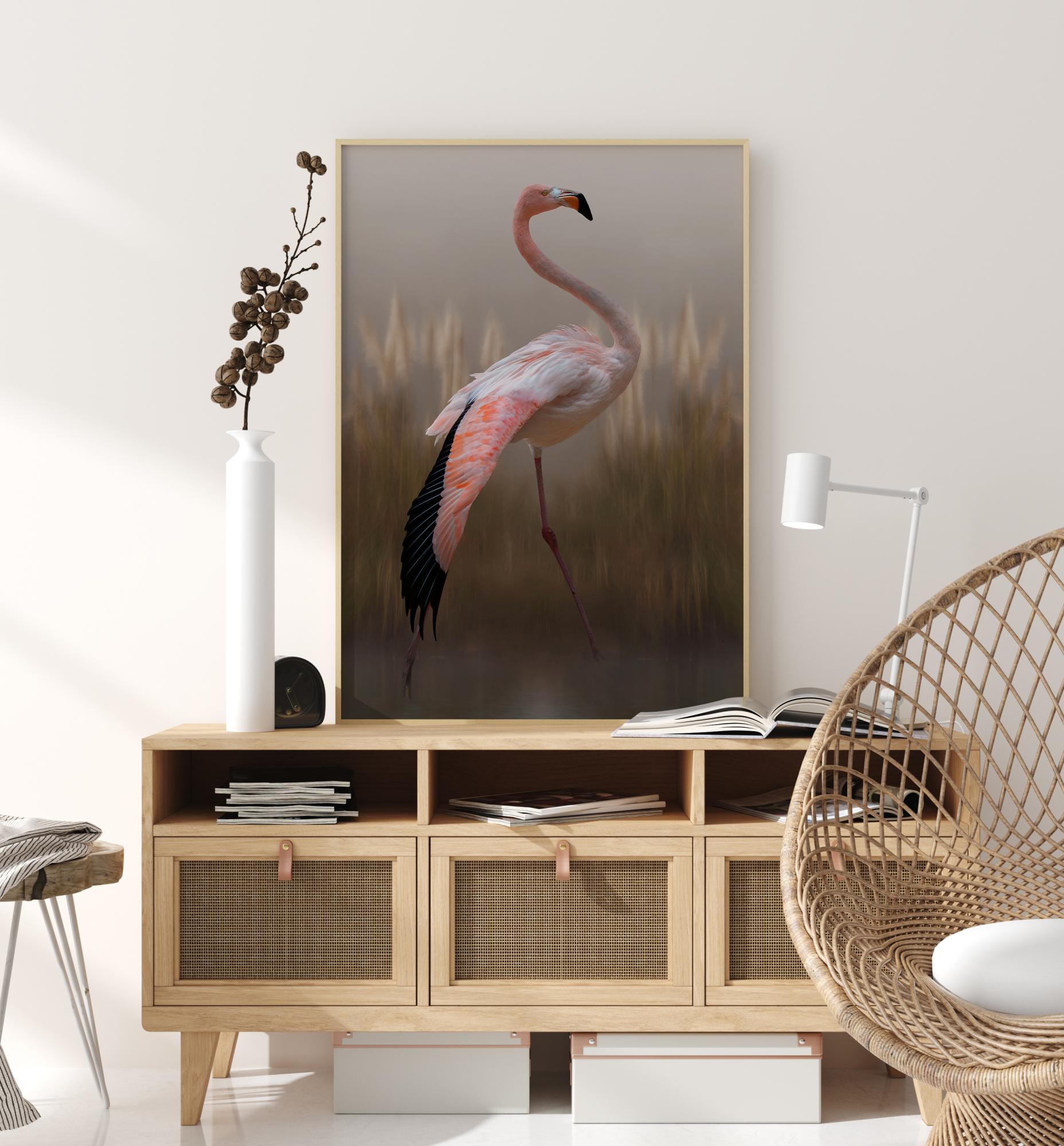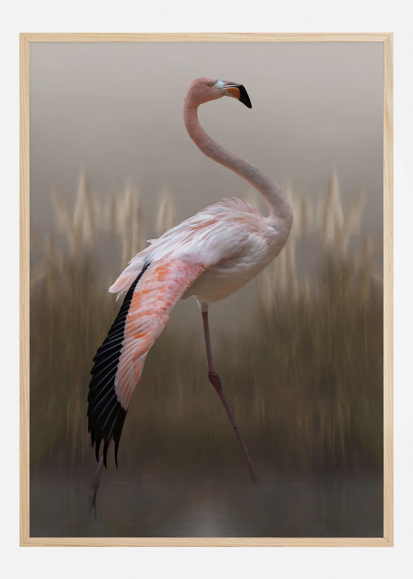 Affiche animalière d'un flamant rose qui se pavane. Les tons et le flou de cette photo lui donnent un aspect presque peint. Pavanez, vous aussi, avec cet oiseau lorsque vous l'associez à un simple fond bleu.