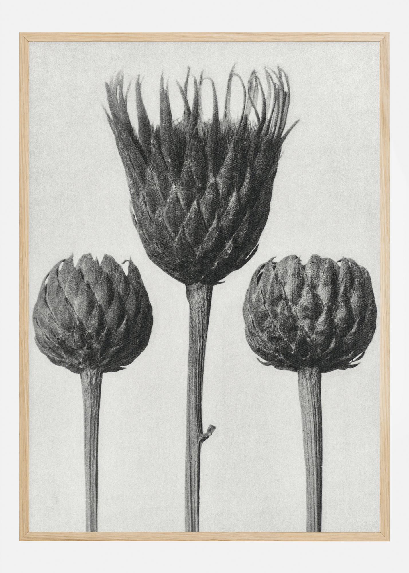 Un poster nature représentant trois fleurs grises à tige unique. Dressées sur un fond blanc, les trois fleurs grises sont presque côte à côte. La fleur grise au premier plan est plus ouverte que les petites fleurs. Une affiche idéale à accrocher dans votre véranda.