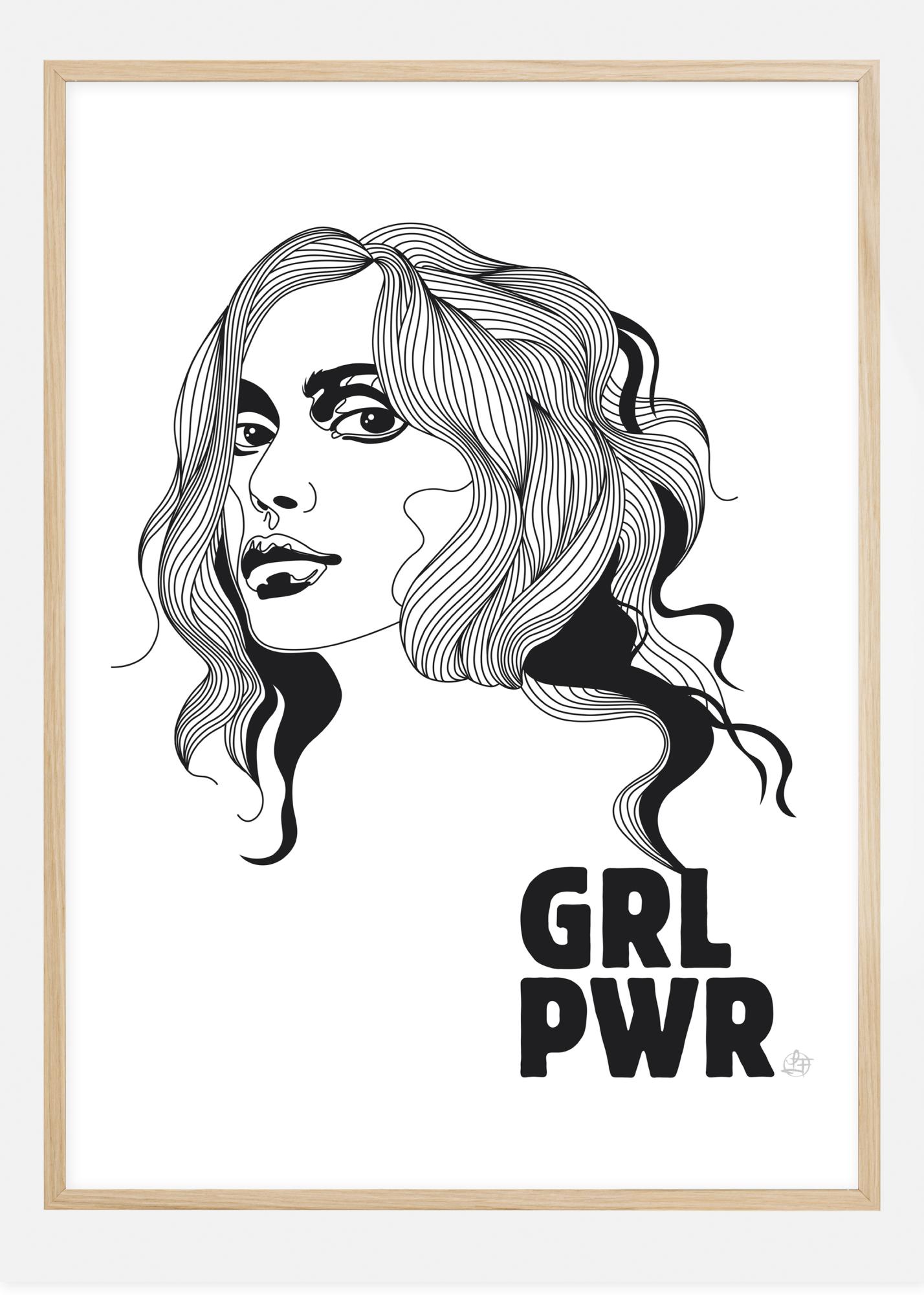 Un poster avec une illustration graphique pleine d'attitude et avec les messages Girl Power (grl pwr), créé par Linda Forsberg. Un poster de texte simple et épuré avec un message clair.