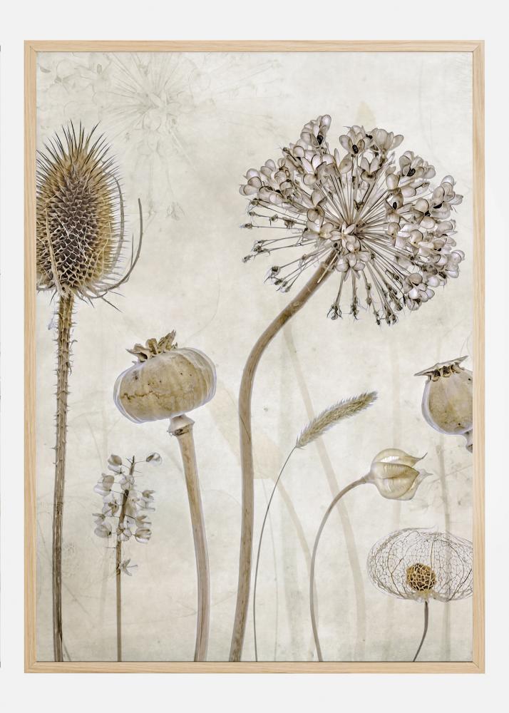 Une affiche élégante d'herbes séchées. Les délicates couleurs beiges créent un sentiment de calme et de chaleur. Avec les herbes séchées flottant dans le vent, ce portrait crée un sentiment de tranquillité. Ajoutez cette image délicate à votre cuisine pour créer cette ambiance de vie naturelle.