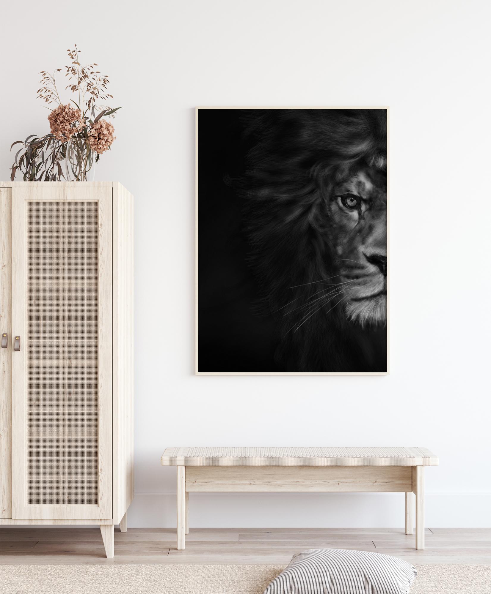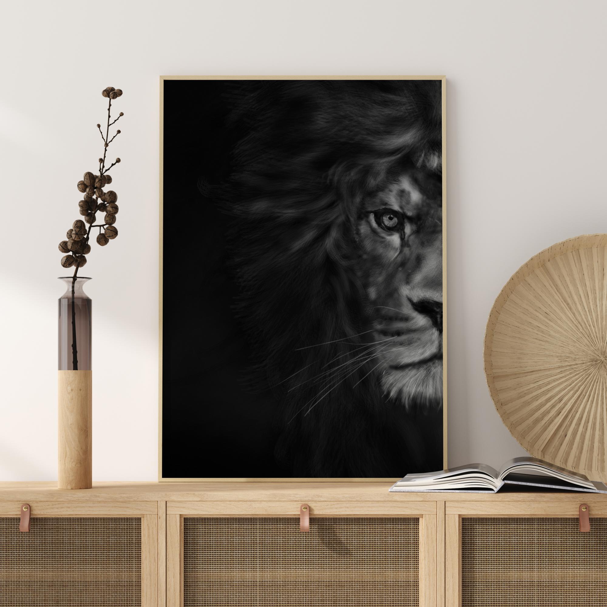 Une affiche imposante d'animaux sauvages en noir et blanc. On y voit un lion féroce qui fixe directement l'appareil photo. Placé à droite de l'image, seule la moitié du visage du lion est visible. Avec sa belle crinière ondulée et sa pose majestueuse, c’est sans conteste le roi de la jungle. Faites entrer une ambiance safari dans votre maison.
