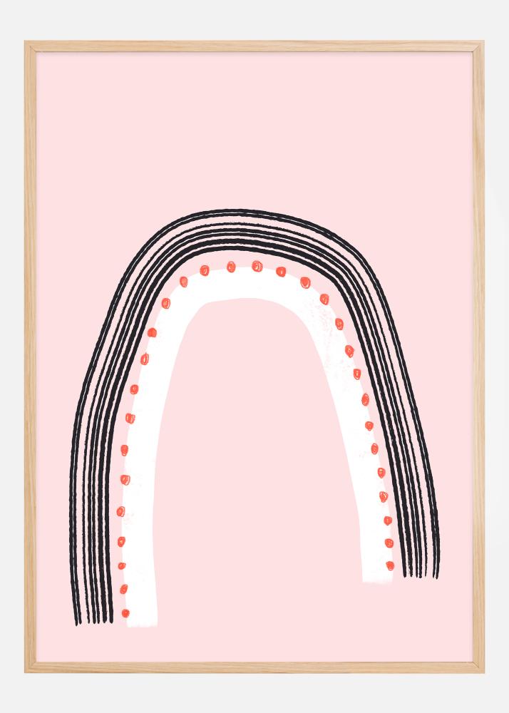 Cette affiche ludique et charmante représente un arc-en-ciel stylisé avec une approche moderne et graphique. Sur un fond rose clair, les contours noirs et audacieux des arcs de l'arc-en-ciel créent un contraste net, tandis qu'une rangée de petits cœurs rouges suit l'une des courbes, ajoutant une sensation irrésistible de joie et de positivité. Cette impression rayonne de simplicité et de joie et pourrait illuminer n'importe quelle pièce avec son charme et son allure amicale.
