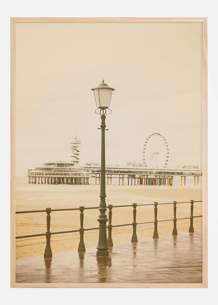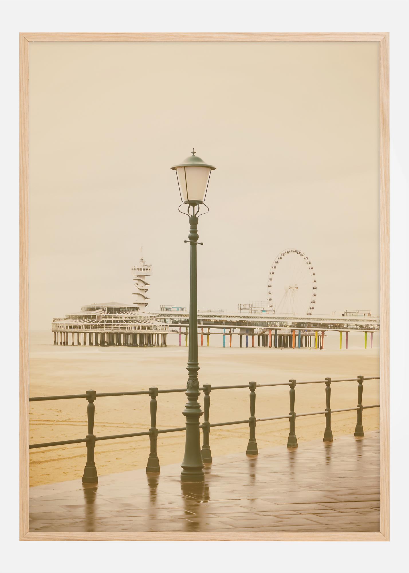 Cette affiche nostalgique évoque la sensation d'une journée lente et rêveuse au bord de la mer. Une lanterne à l'ancienne se tient au premier plan, gardienne tranquille de la promenade déserte avec sa balustrade classique. En arrière-plan, un pier avec une tour d'observation et une grande roue apportent une touche de romantisme intemporel des fêtes foraines. Les tons doux de sépia et beige renforcent le sentiment d'une époque révolue et invitent à la réflexion.