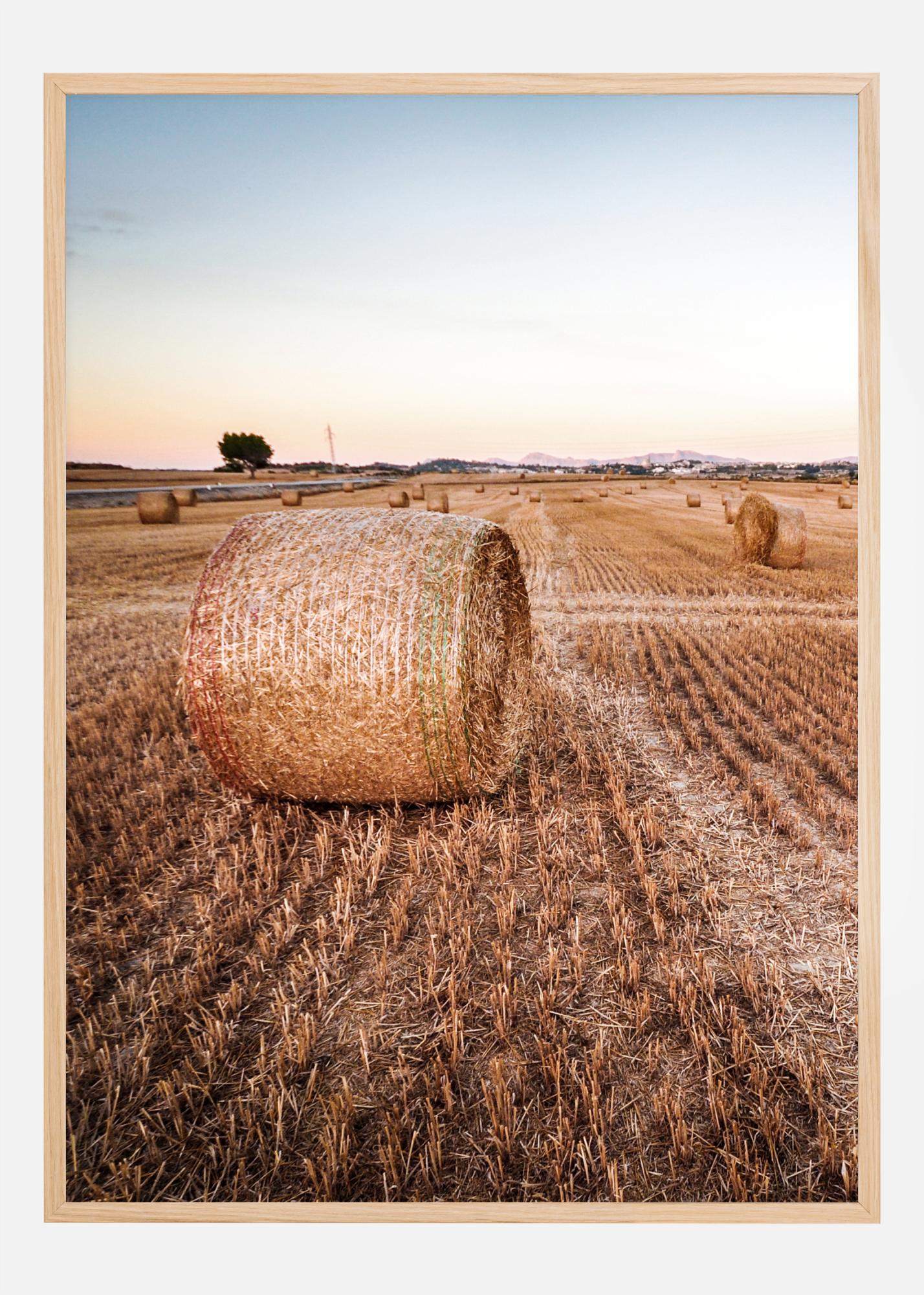 Une affiche simple mais magnifique de la nature. La meule de foin au premier plan a été roulée proprement, prête pour la récolte, tandis qu'au loin, d'autres meules de foin sont éparpillées dans les champs. Un ciel bleu pâle et les couleurs brunes chaudes créent une image chaleureuse et relaxante à accrocher dans une cuisine de campagne.