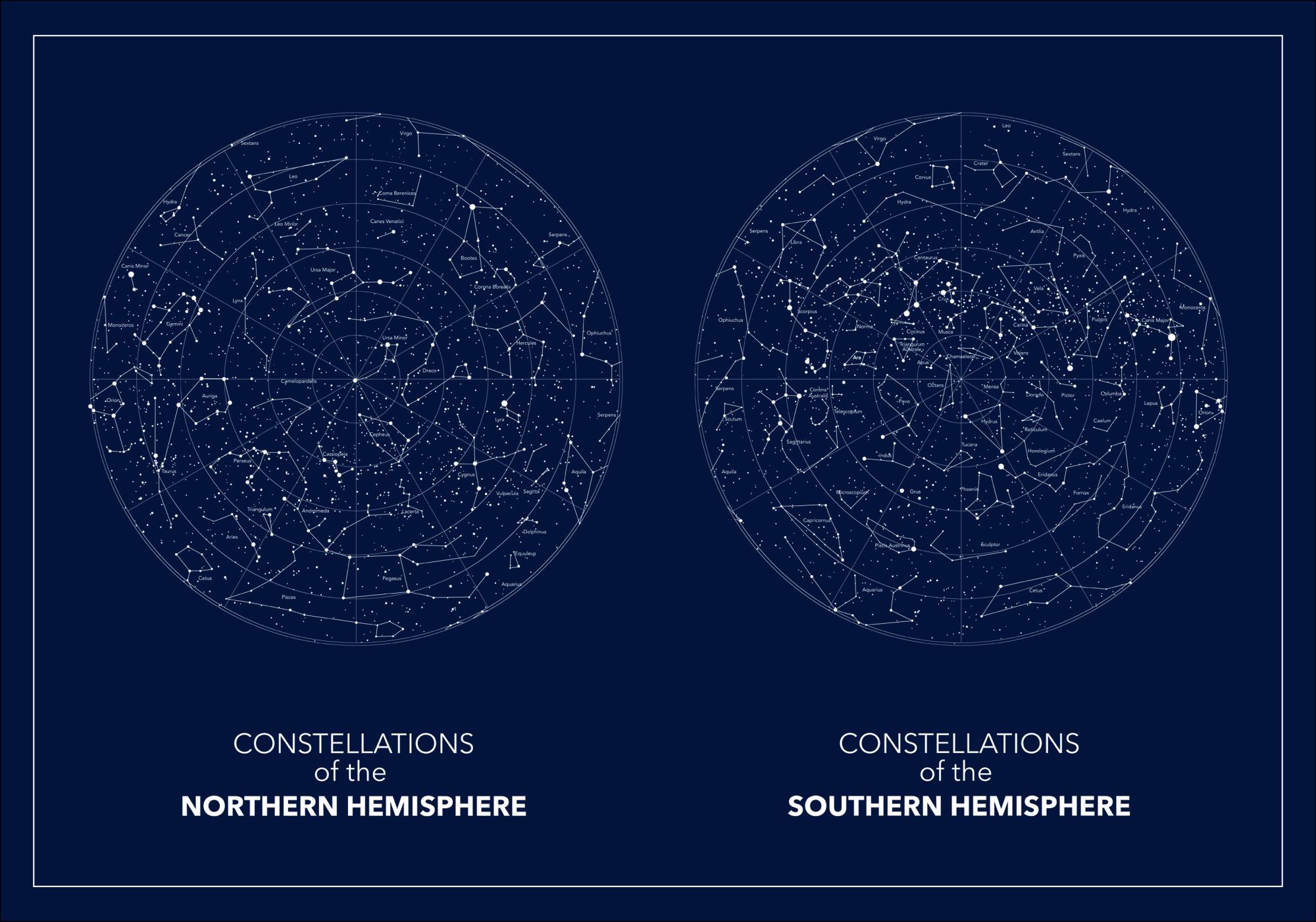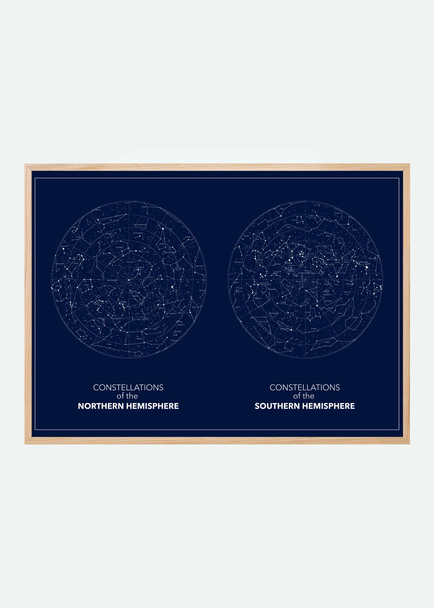 Une affiche bleu foncé fascinante représentant les hémisphères nord et sud. Les deux images sont placées l'une à côté de l'autre. Sur un fond bleu foncé, les constellations sont légèrement soulignées en blanc. Accrochez ce tirage dans votre bureau pour créer un sentiment d’espace.