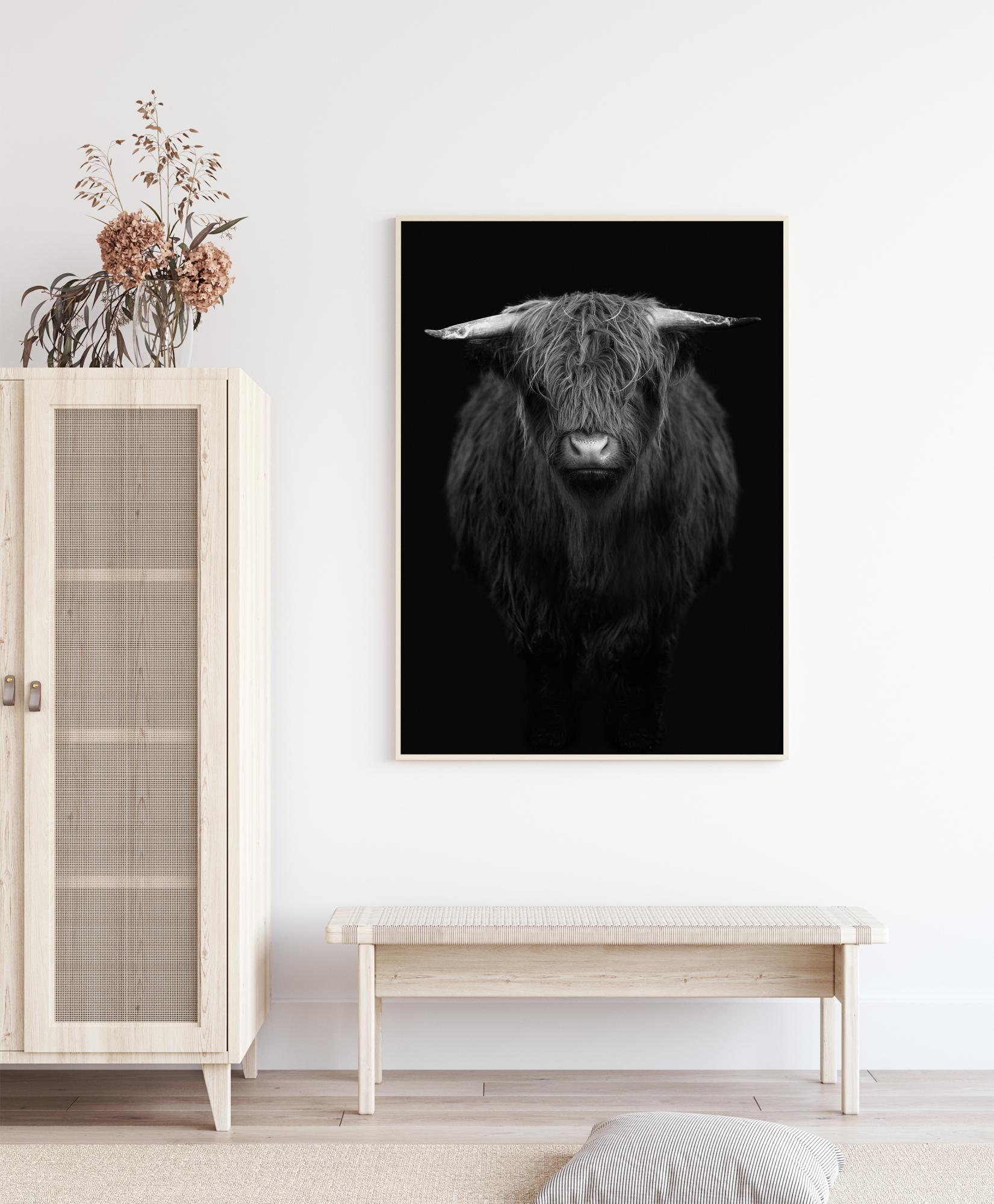 Affiche d’une impressionnante vache noire des Highlands sur un fond noir. Regardant droit dans l'appareil photo, cette belle créature montre son long pelage noir ondulé. Bien que cette impression soit une image noir sur noir, les cornes et le nez blancs de la vache ressortent considérablement. Admirez la beauté de cette créature qui regarde fixement l'appareil photo.