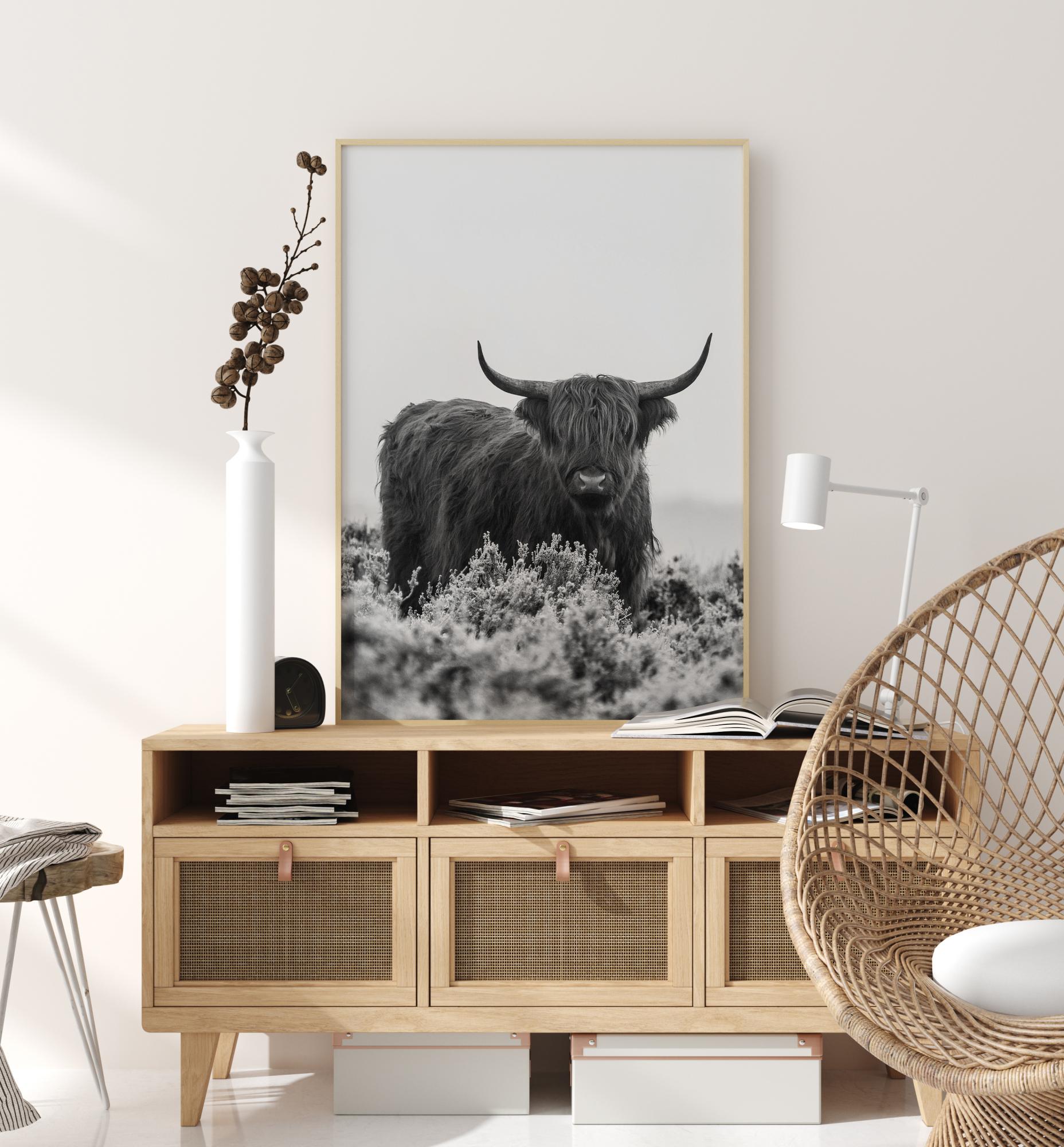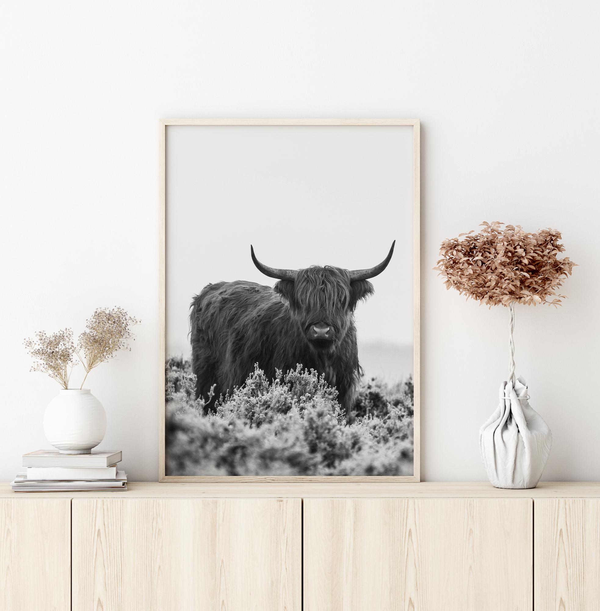 Un magnifique imprimé animalier représentant une vache solitaire dans les landes. Entouré de hautes herbes, ce magnifique animal regarde droit dans l'appareil photo. Sur fond de ciel gris et d'herbe haute, vous pouvez presque sentir le vent froid sur votre visage. L’affiche parfaite pour les amateurs d'animaux.