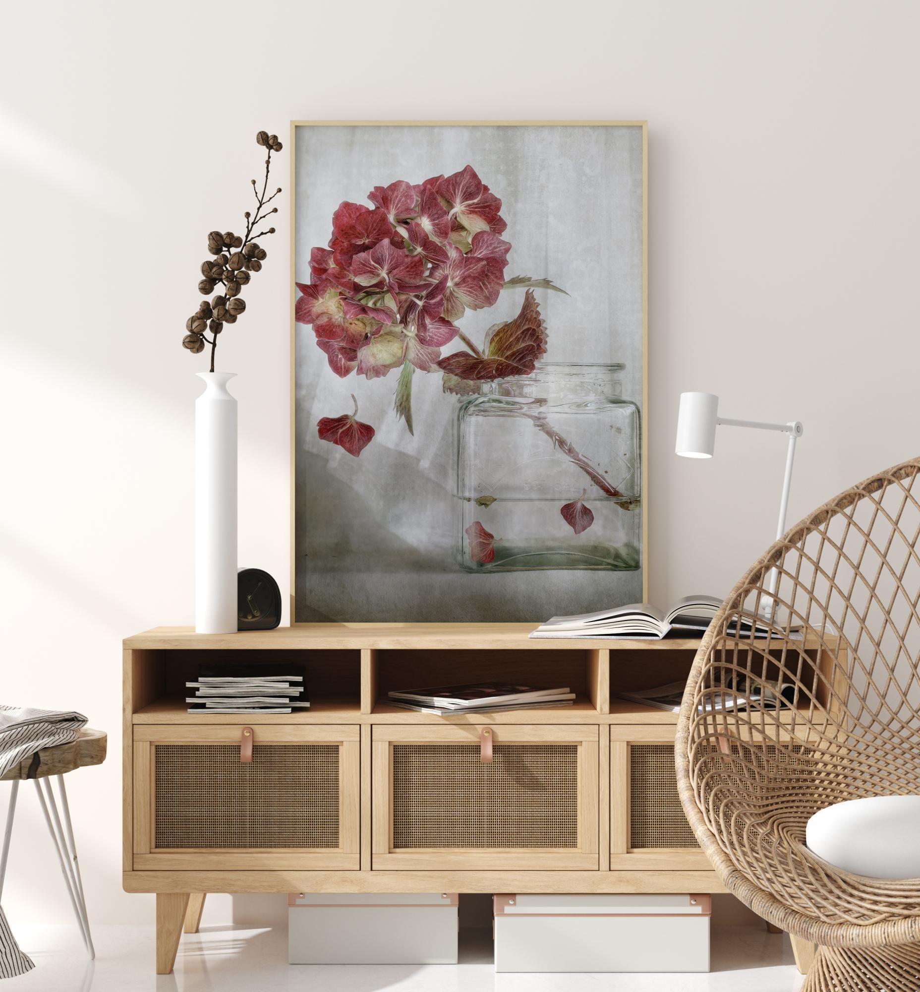 Une jolie affiche nature d'un hortensia dans un vase transparent. Placé devant un rideau blanc fleuri, un délicat pétale rose tombe. Un vent doux souffle sur le rideau. Sentez la brise fraîche de cette image.