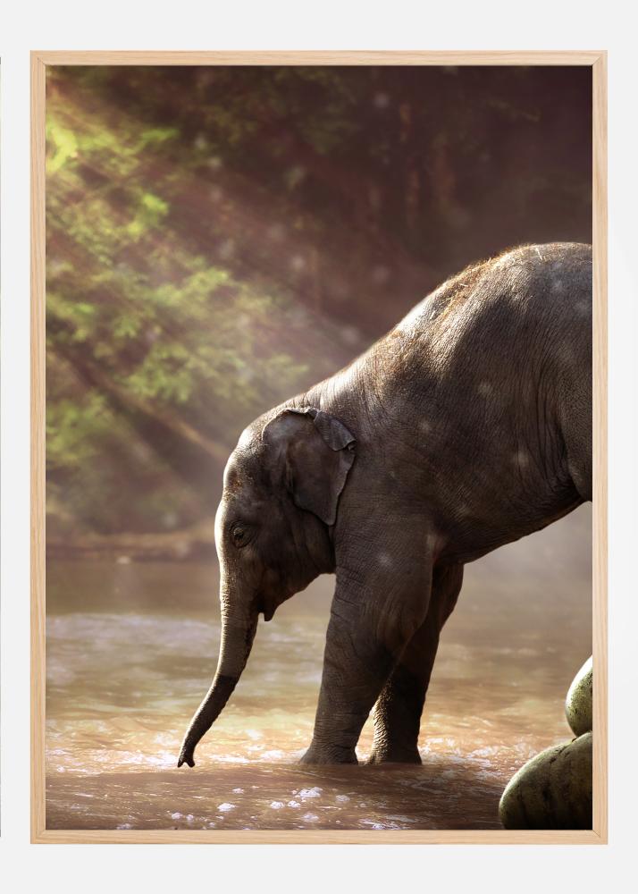 Une douce affiche d'un éléphanteau encouragé par sa mère à entrer dans la rivière. La lumière du jour brille à travers les arbres et se reflète sur l'eau, créant une sensation de chaleur. Alors qu’il hésite à entrer dans l'eau, sa mère pousse doucement son bébé sur les rochers. Une impression douce qui reflète l'amour inconditionnel entre une mère et son enfant.