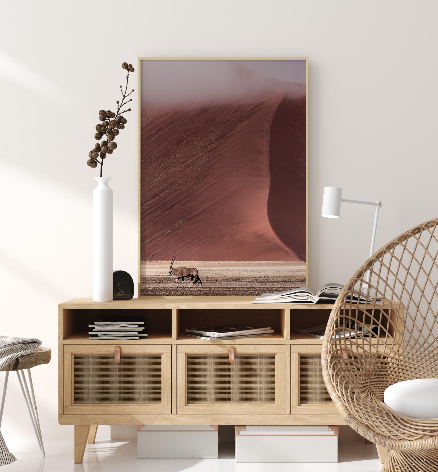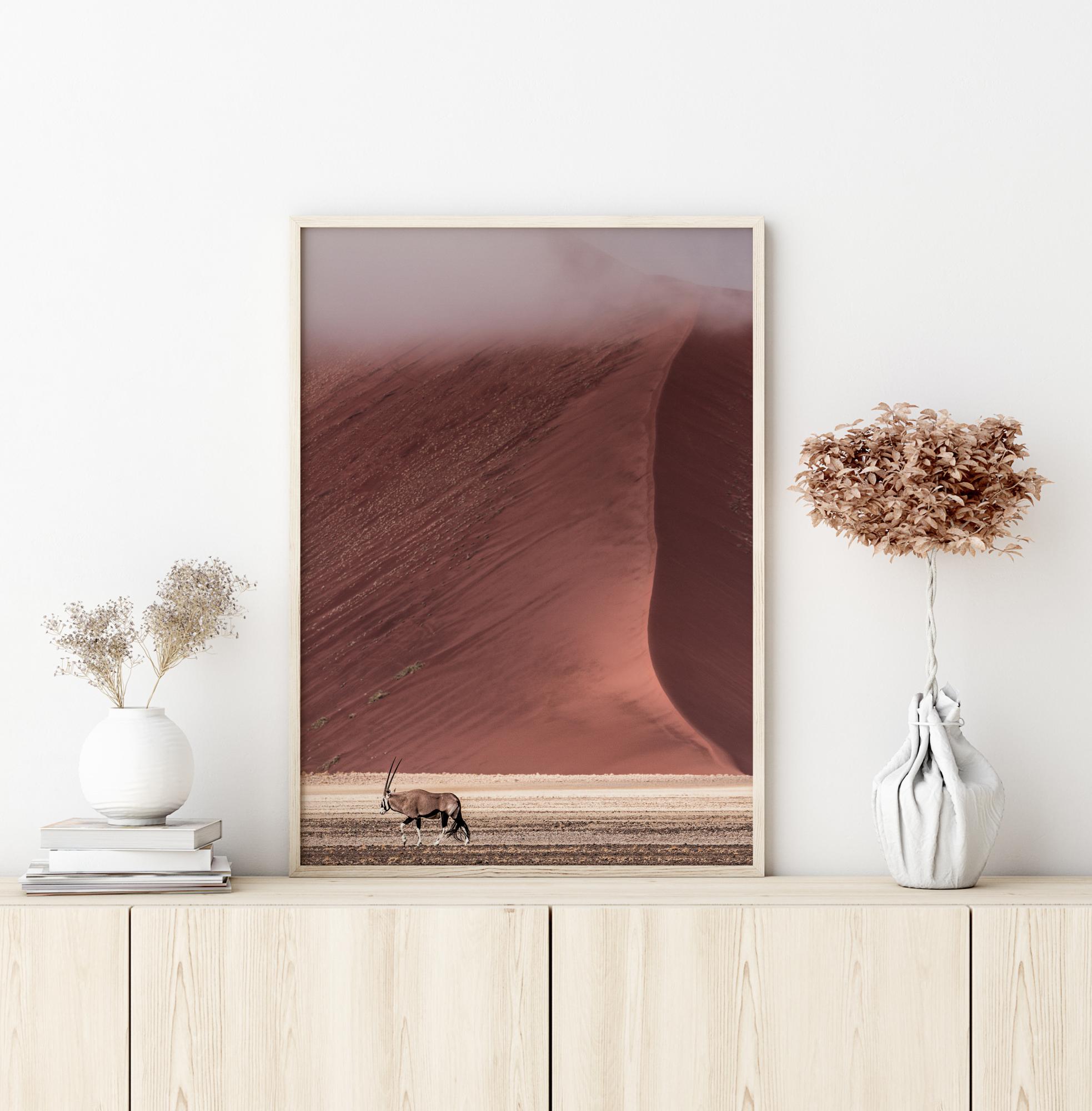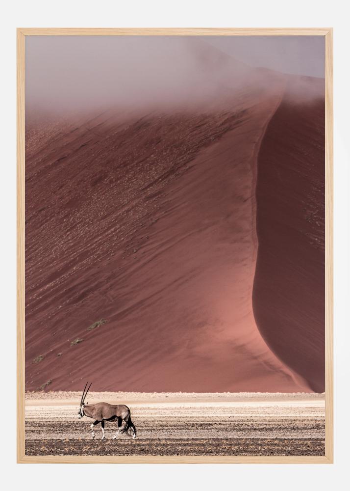Une simple affiche d'une gazelle fatiguée traversant le désert. À l'arrière-plan, une impressionnante dune rouge rencontre le sol sablonneux au bas de l'impression. Les belles couleurs commencent à s'estomper, tandis que le brouillard du désert s’abat. Sur un fond crème, ces couleurs apaisantes proposent une magnifique scène naturelle.