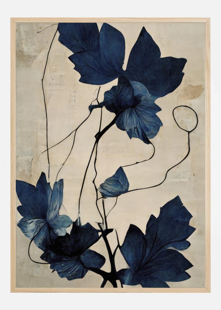 Cet affichage capture une fascinante beauté botanique avec sa représentation détaillée et réaliste de fleurs dans une couleur bleu indigo profond. Les feuilles et les nuances intenses et sombres des fleurs contrastent avec un fond semblable à du papier vieilli, ce qui donne une sensation antique et intemporelle. Cet imprimé est un hommage à l'illustration botanique classique et donne une impression élégante et sophistiquée dans n'importe quelle pièce où il est placé.