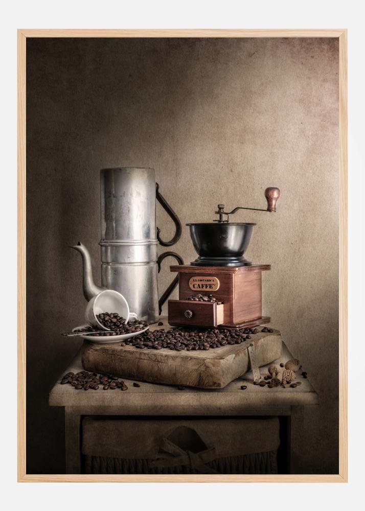 Une affiche sur le thème du café, avec un moulin à café, une cafetière, des grains de café ainsi qu’une tasse et une soucoupe blanches. Les tons bruns doux de ce tirage créent une image relaxante où vous pouvez presque sentir l'odeur du café torréfié. L'image parfaite à accrocher dans la cuisine.