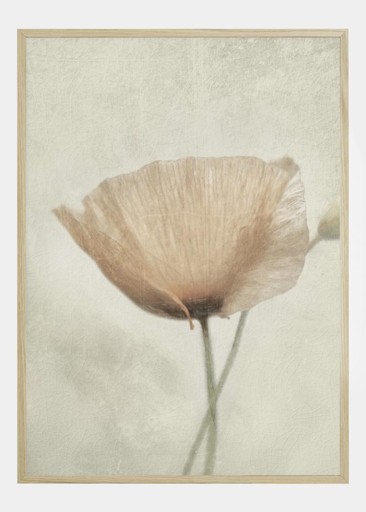Un magnifique portrait de nature représentant un coquelicot de couleur pêche sur un fond beige. Avec ses pétales aux couleurs douces largement ouverts, il évoque un sentiment de paix et de tranquillité. La transparence des pétales laisse apparaître le cœur noir de la fleur. Une affiche pleine de sens à accrocher sur un mur de couleur claire.