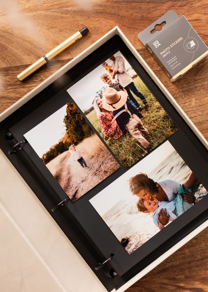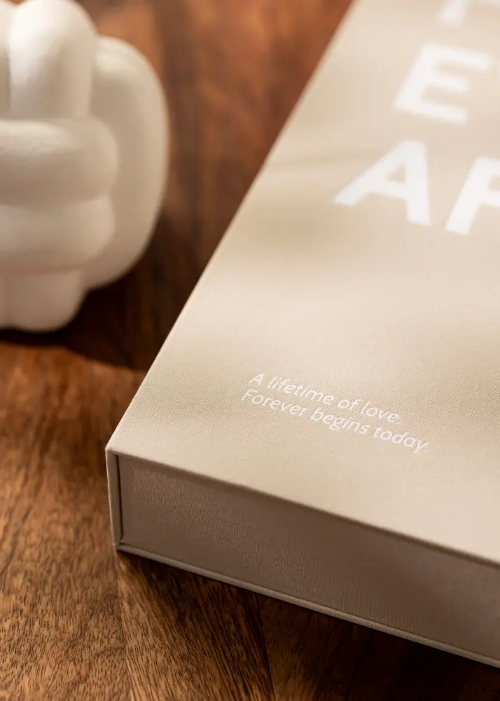 KAILA Happily Ever After est un album de mariage exclusif et élégant au design épuré couleur crème. Il est conçu comme un album de table basse, ce qui en fait un bel élément de décoration intérieure tout en préservant vos moments les plus mémorables. L'album contient 60 pages noires, sans acide, où vous pouvez fixer vos photos de mariage de manière élégante. Parfait pour créer une collection intemporelle de souvenirs du grand jour.