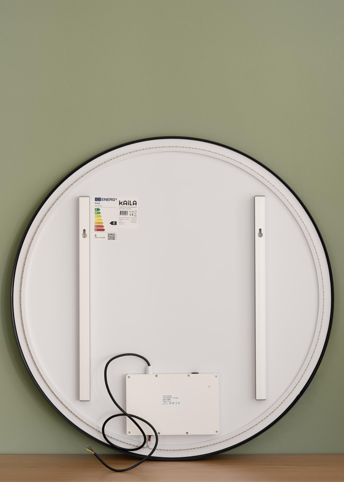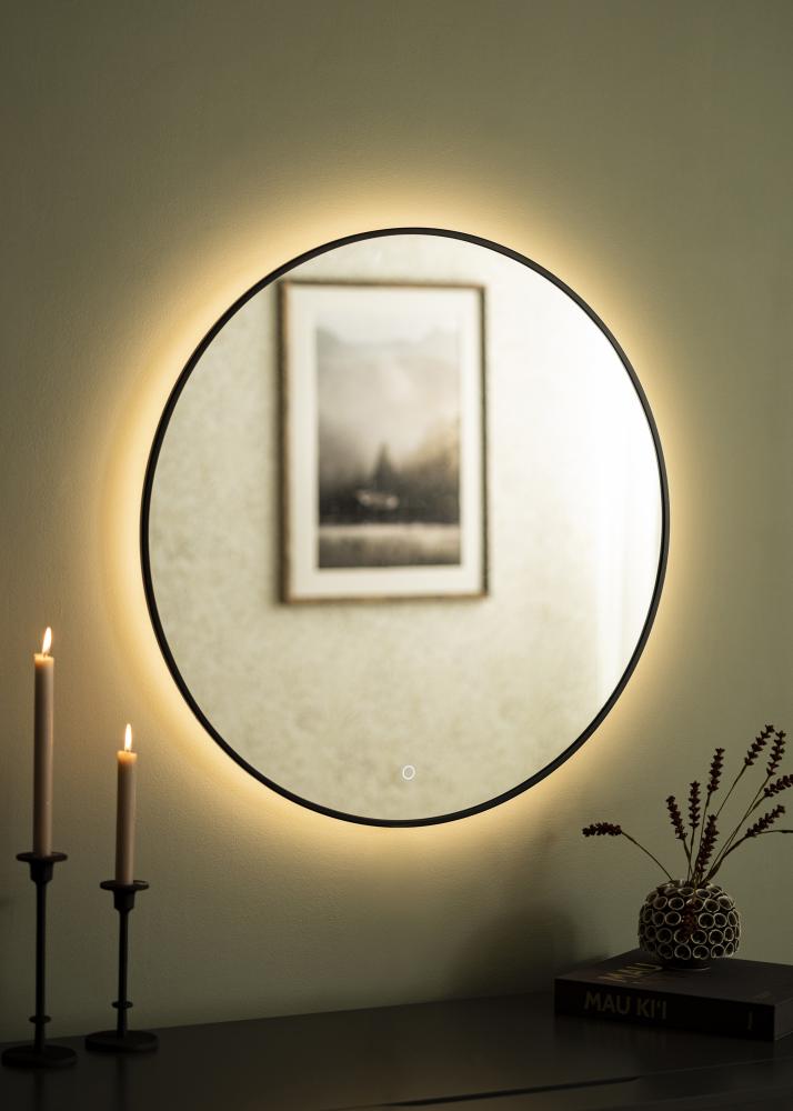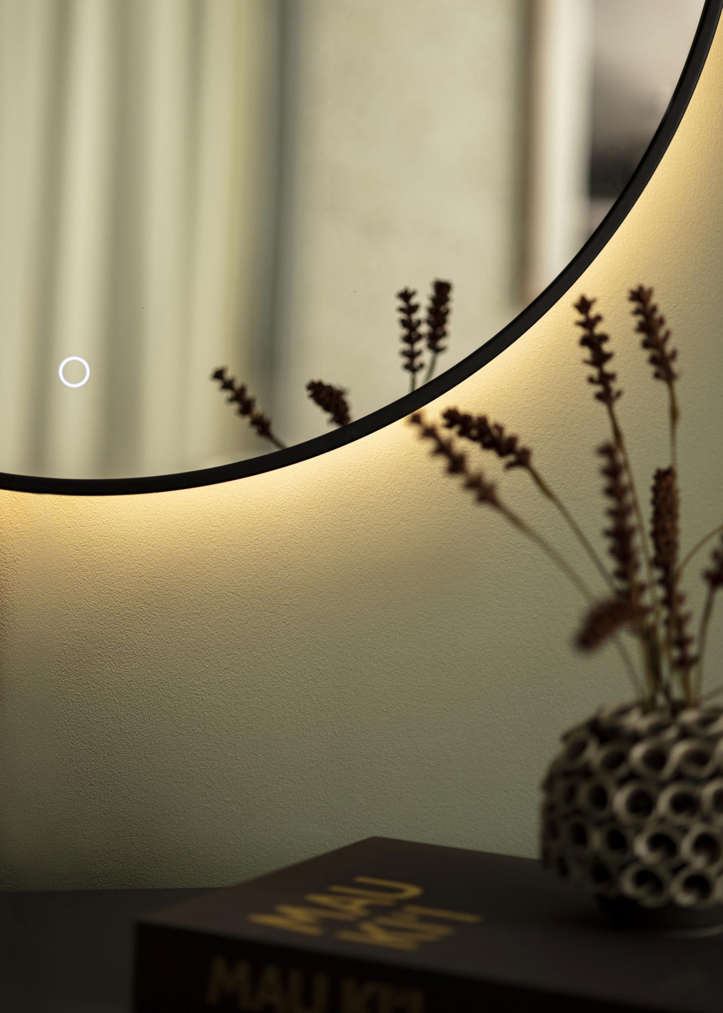 Voici un beau miroir avec un éclairage LED, qui sera tout aussi beau dans le hall d'entrée comme dans la chambre à coucher. Le miroir a une forme ronde classique et un cadre en métal dans une couleur noire sophistiquée. L'éclairage LED intégré du miroir en 3000K peut être ajustée entre 10% et 100% de sa puissance lumineuse. Cela vous permet de régler facilement l'éclairage sur la luminosité que vous préférez et de la modifier si vos besoins changent. Pour tamiser la lumière, appuyez sur le bouton tactile situé sur la partie inférieure de la surface du miroir pendant quelques secondes. L'éclairage LED est placé dans le bord arrière du miroir, ce qui donne un éclairage à l'aspect plus doux.
