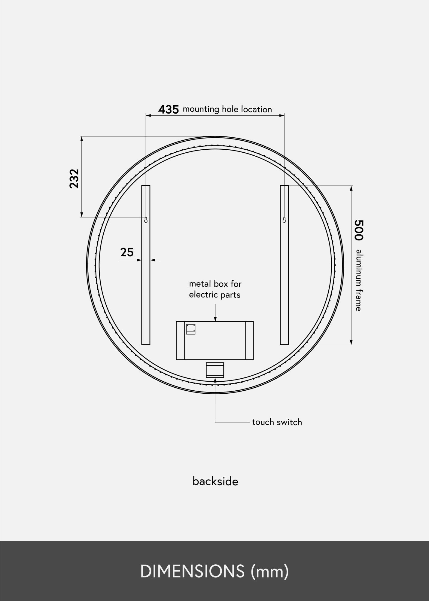 Ce miroir mural a une surface réfléchissante d'un diamètre de 78,5 cm. Il est destiné à une installation fixe et doit être raccordé à un interrupteur. Pour que le miroir fonctionne correctement, il doit être connecté à un interrupteur habituel et non à un gradateur.