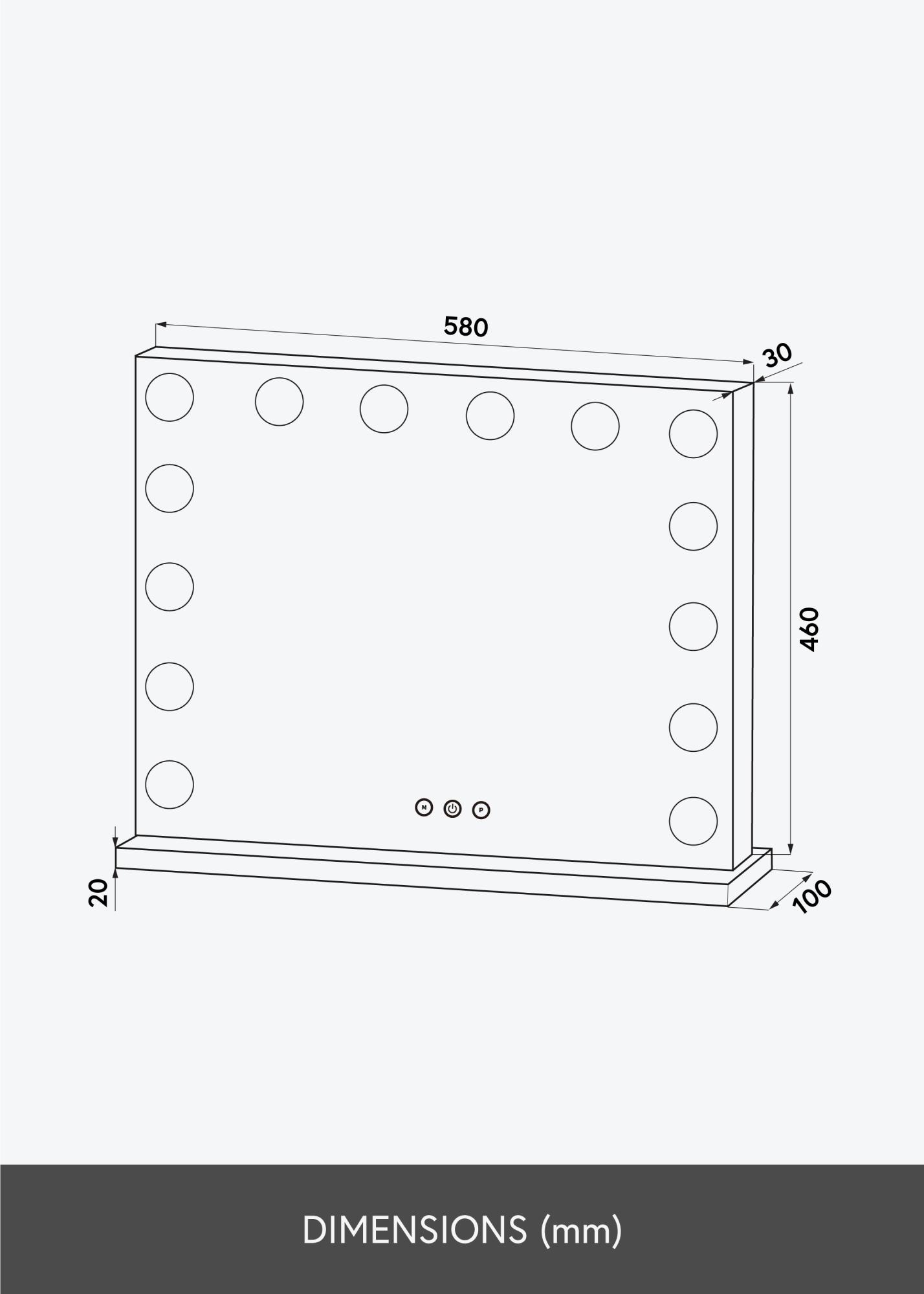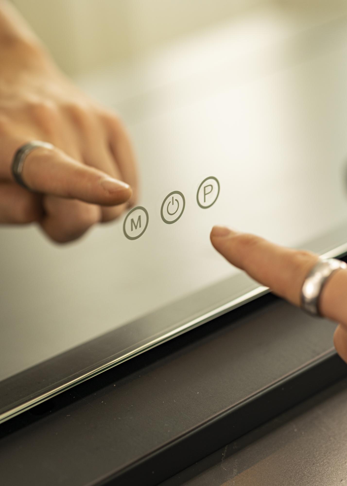 Vous pouvez régler les paramètres d'éclairage du miroir à l'aide des boutons tactiles situés sur le bord inférieur du miroir. Le bouton marqué d'un "M" modifie la température de couleur de la lumière qui peut se situer entre les valeurs 3000K et 6000K, et le bouton marqué d'un "P" permet d'atténuer la luminosité. Il y a également un bouton pour éteindre et allumer l'éclairage. Le raccordement électrique se fait via une prise de courant.