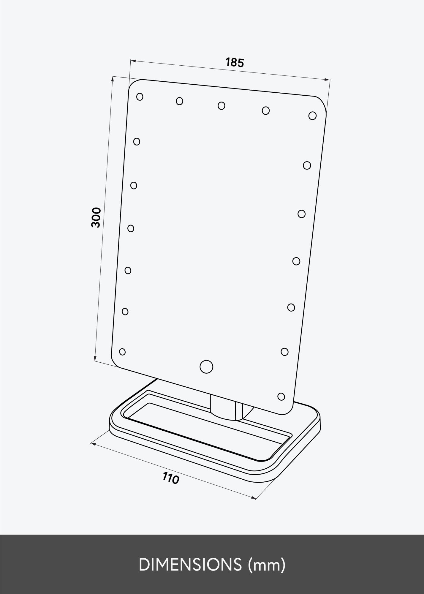 Le miroir a un éclairage LED intégré qui s'allume avec un bouton on/off à l'arrière. L'éclairage donne une lueur blanche froide qui peut être atténuée. Pour régler la luminosité, maintenez le bouton tactile sur l'avant du miroir pendant plusieurs secondes. La batterie du miroir est alimentée par des 4 piles AA, qui s'achètent séparément.