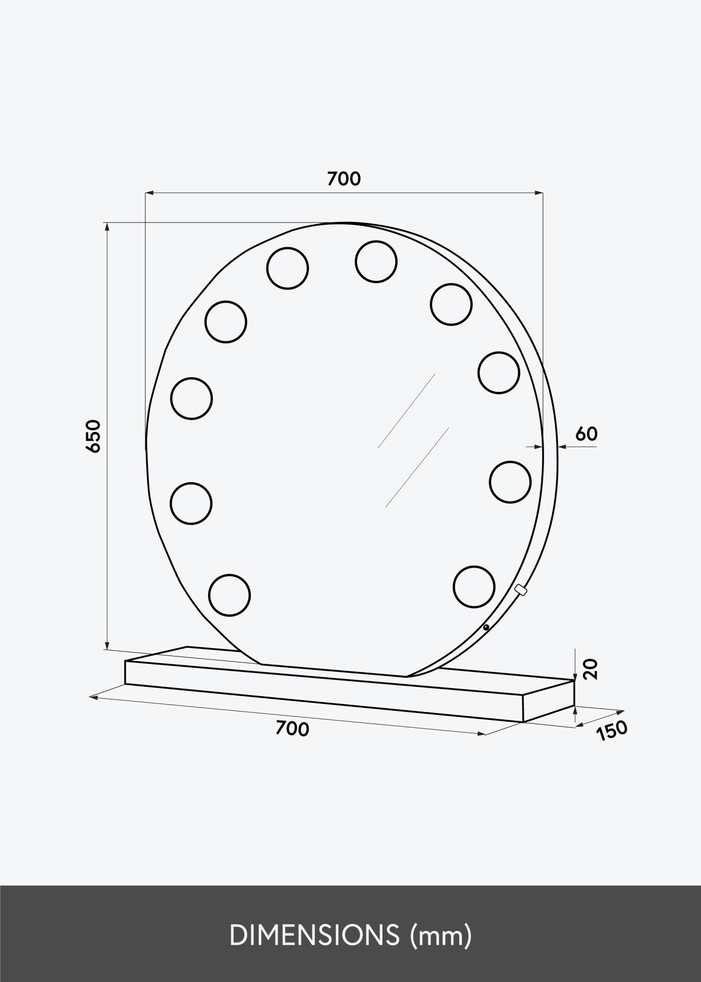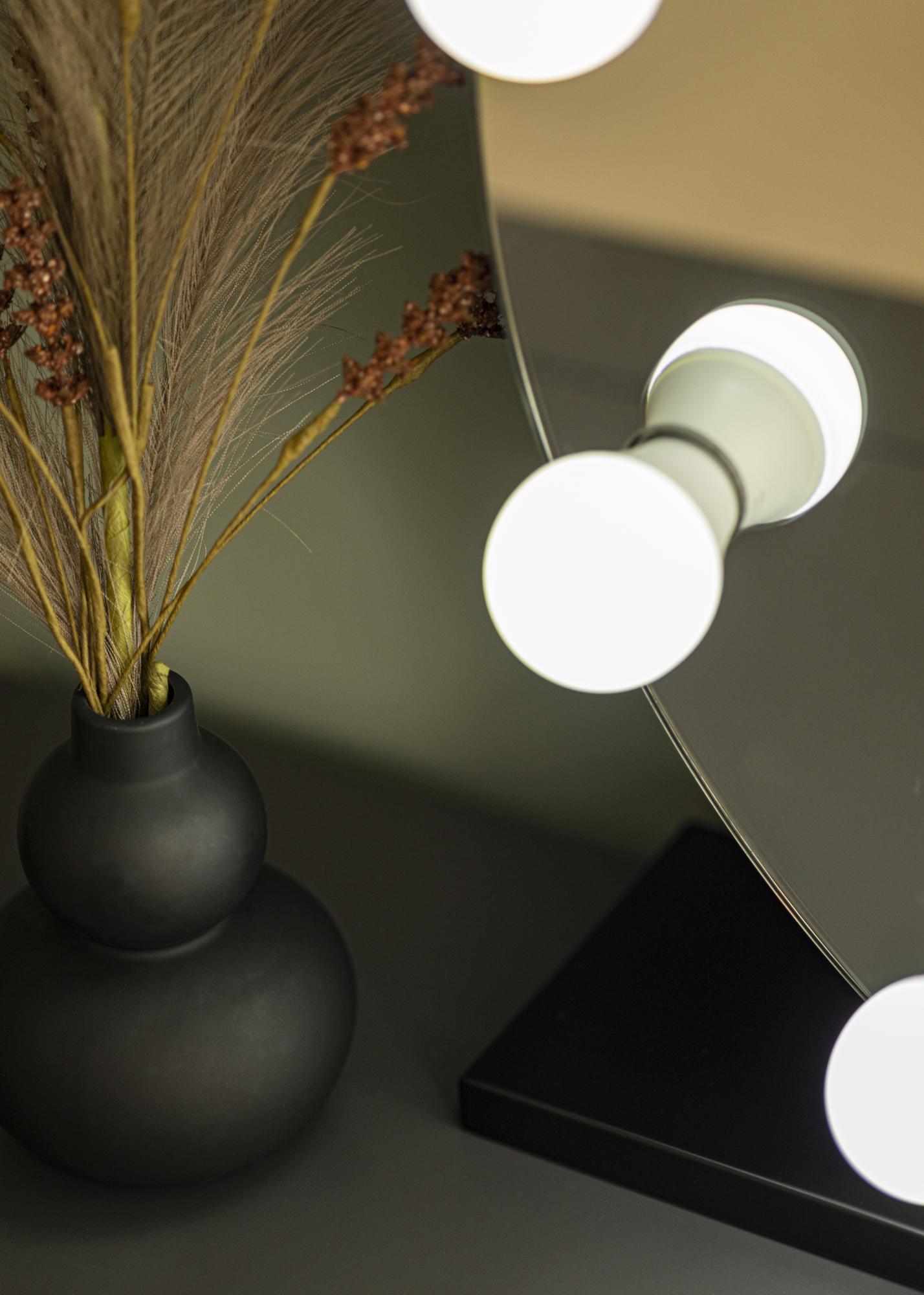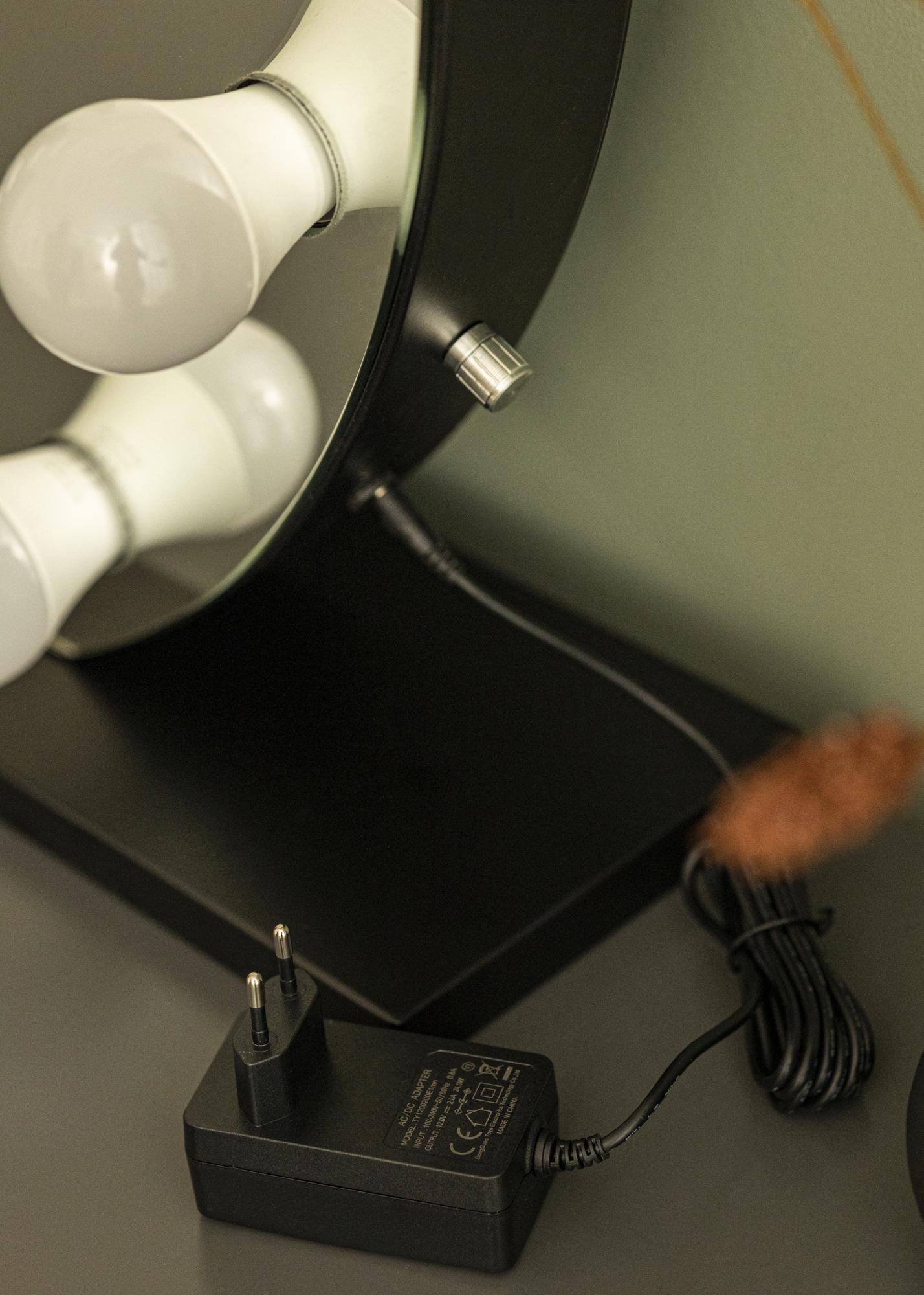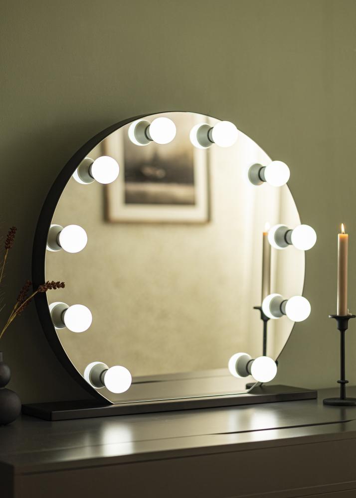 Ce miroir à maquillage décoratif apportera du style et de la fonction en même temps ! Il a un design très esthétique, avec un pied de support noir et un cadre noir décoré de 10 ampoules au culot E27. La lumière blanche froide de son éclairage intégré est idéale pour que vous puissiez vous préparer avant de commencer votre journée. Il suffit de poser le miroir, ce qui le rend très facile à installer dans la chambre à coucher, le salon ou bien le hall d'entrée, là où l'éclairage du miroir à maquillage peut même servir d'éclairage décoratif. L'éclairage peut être atténué et afin d'ajuster l'éclairage vous n'avez qu'à tourner le bouton de gradateur placé sur un côté du miroir.