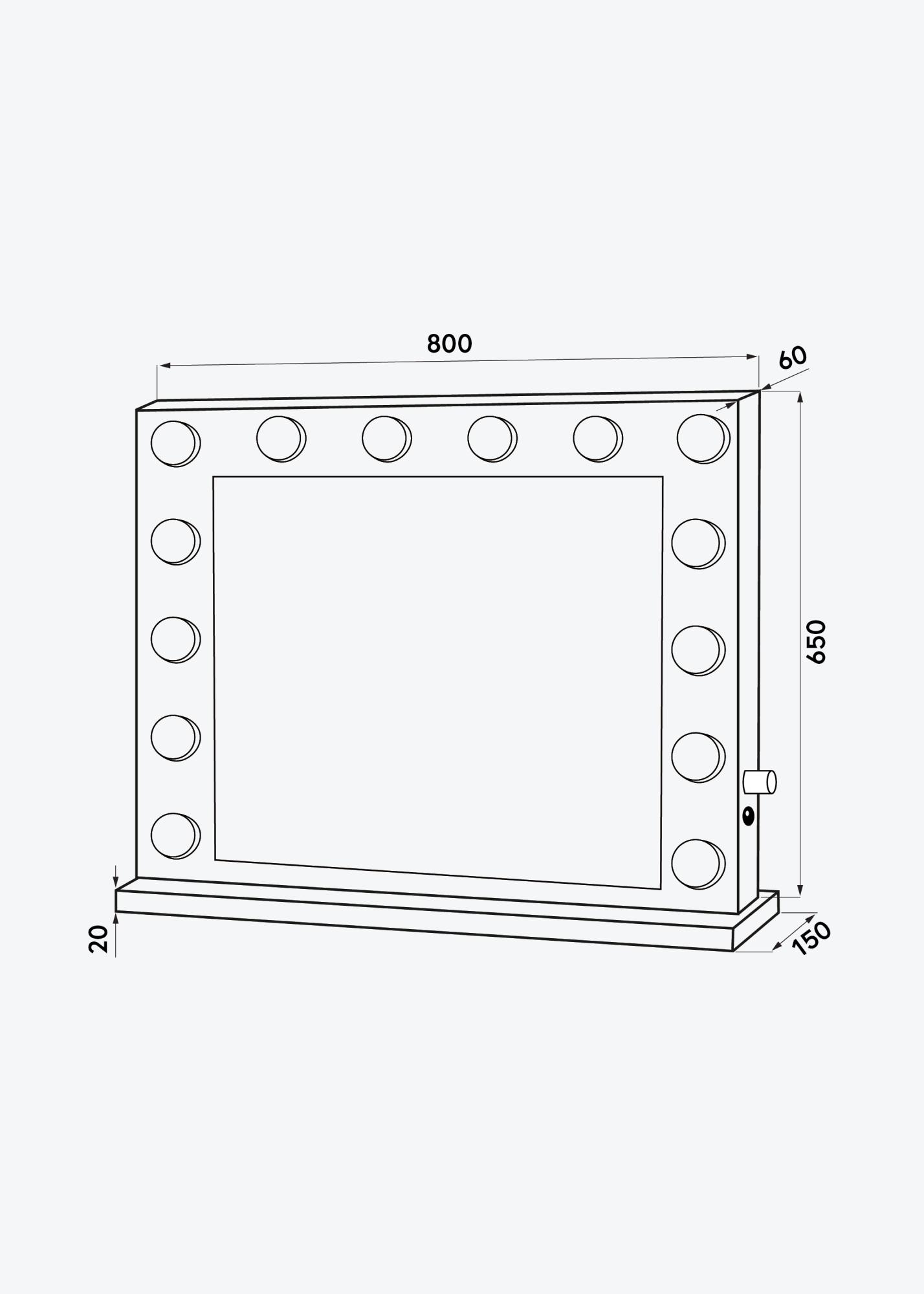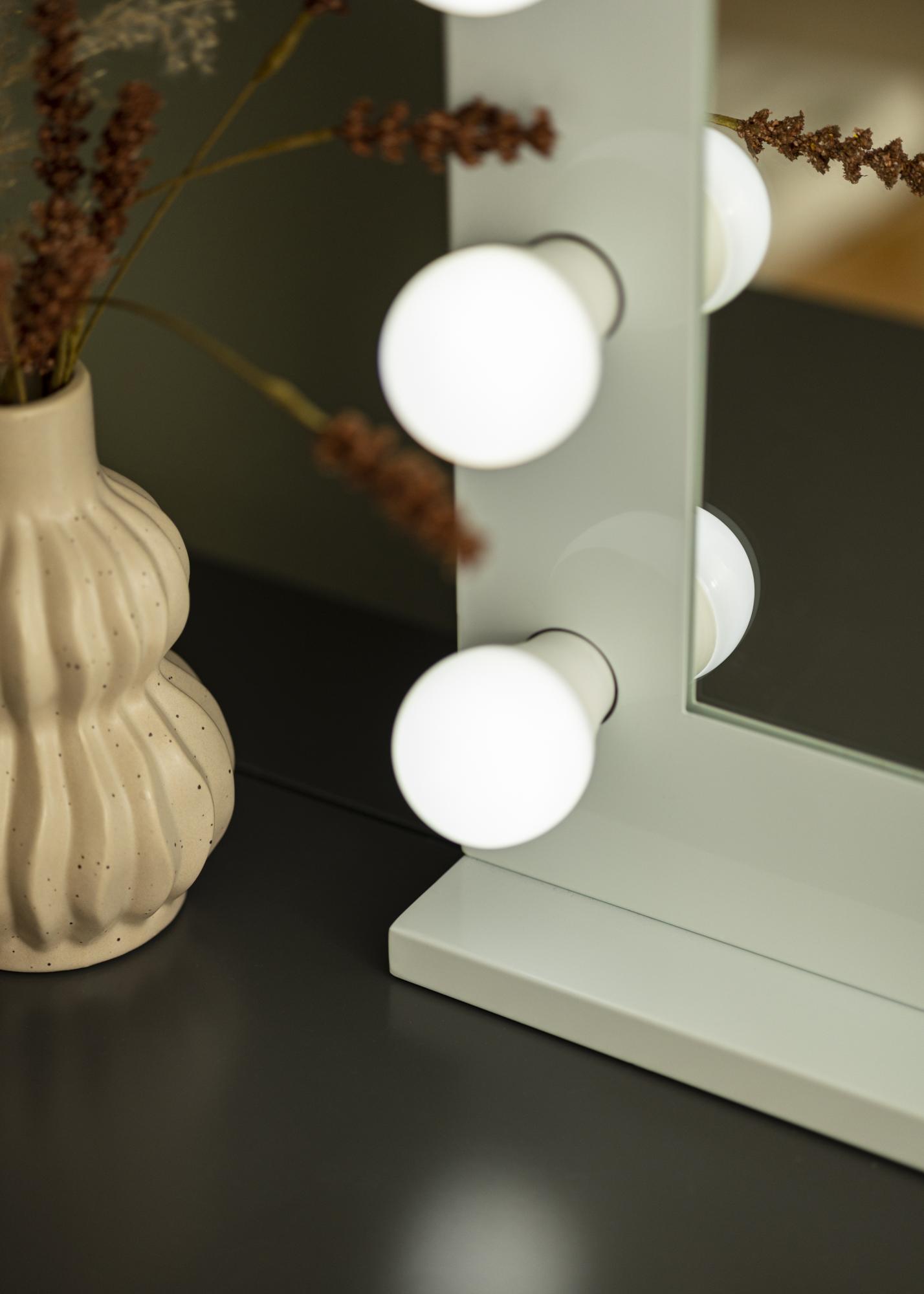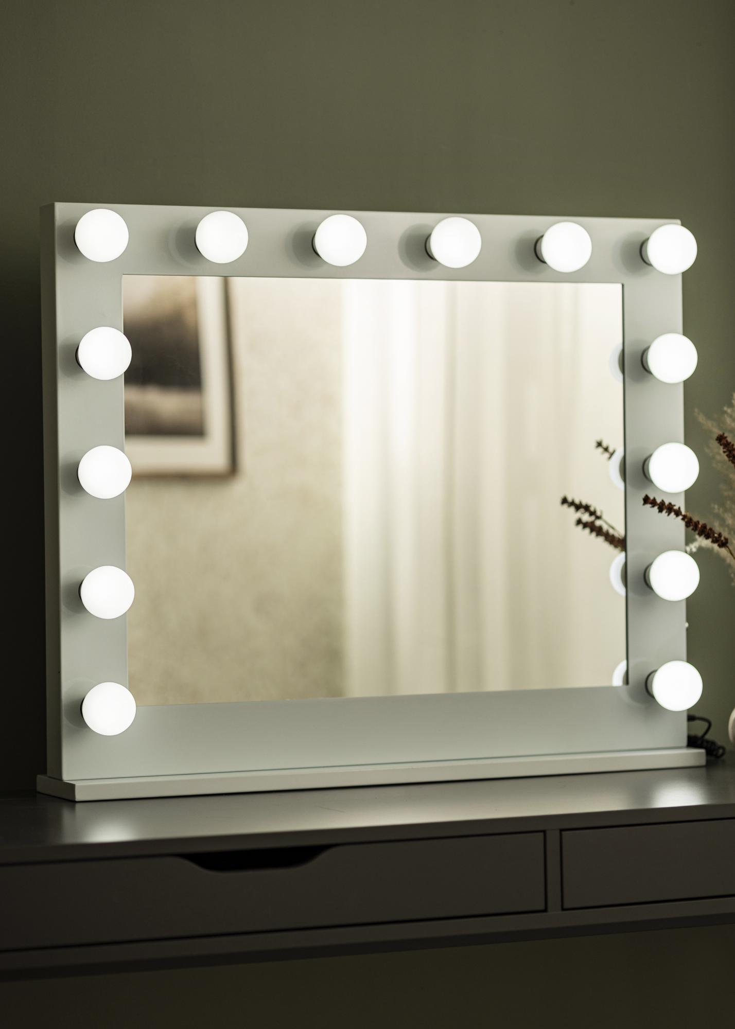 Voici un grand miroir à maquillage avec éclairage intégré – idéal pour appliquer votre make-up ou bien pour vous reflétez avant de débuter votre journée. Ce grand format, avec une surface réfléchissante d'une totalité de 80x65 cm combinée à un cadre blanc esthétique doté de 14 ampoules remplaçables, donnent au miroir cet aspect de glamour hollywoodien. Les ampoules ont un culot E27. Le miroir se pose sur un buffet, une commode ou bien toute autre surface plane que vous désirez décorer avec un joli miroir à maquillage.