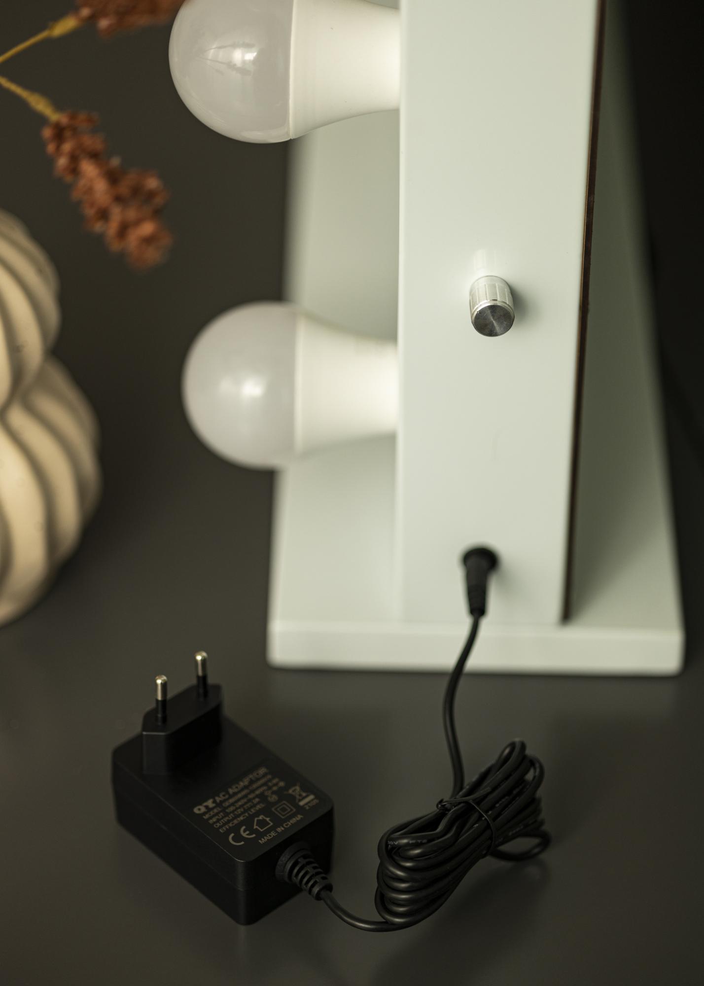 Les ampoules du miroir apportent une lumière blanche froide. Si vous désirez atténuer votre éclairage, vous le faites à l'aide d'un bouton rotatif très pratique situé sur l'un des côtés du miroir. Le raccordement électrique s'effectue avec une prise.