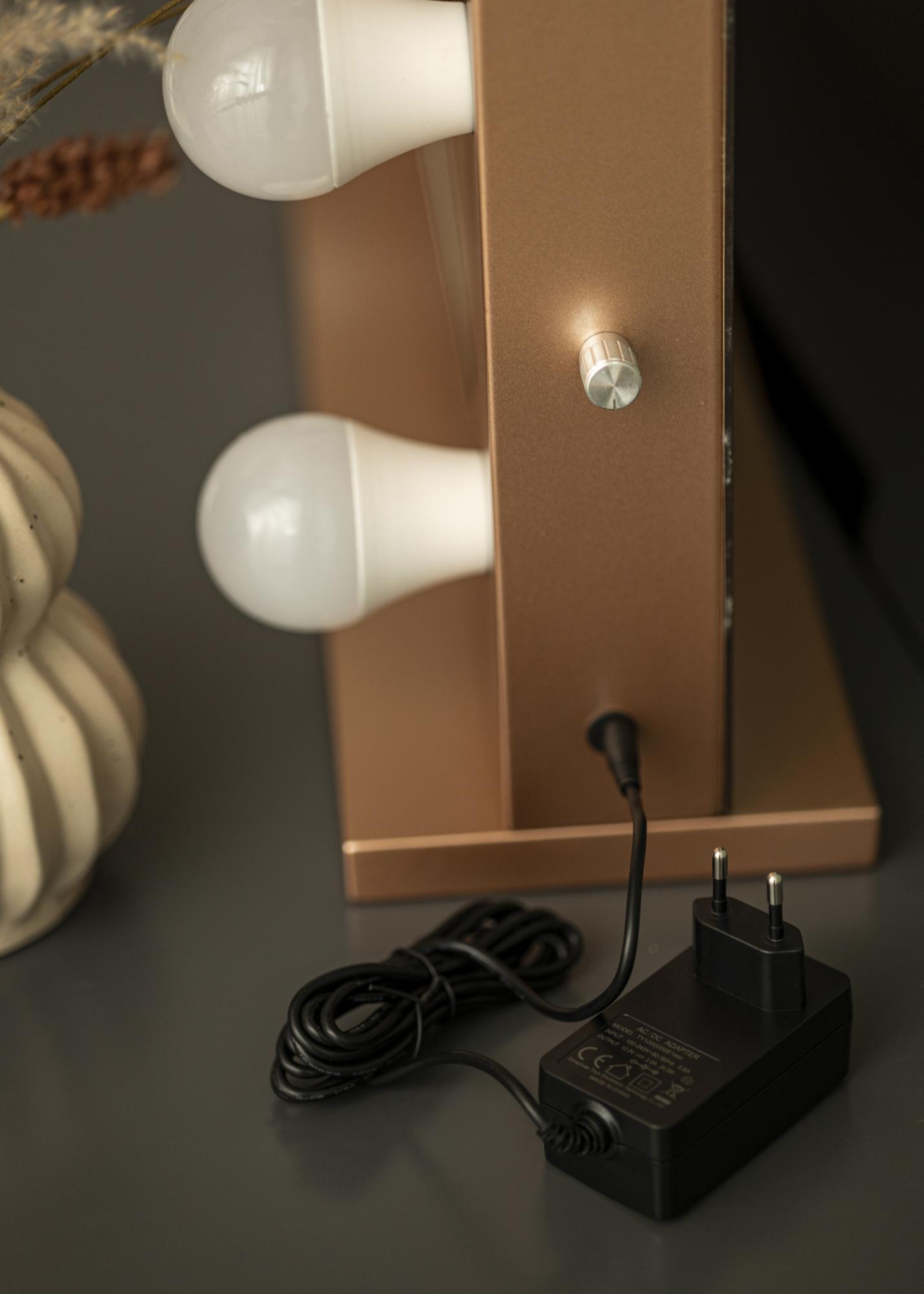 L'encadrement rose-doré est assorti d'un pied dans la même teinte élégante, ce qui fait de ce miroir un détail d'intérieur parfait à poser sur les tables et les commodes. Si vous préférez l'accrocher au mur, cela est possible grâce aux supports muraux à l'arrière du miroir, et en démontant le socle. Le miroir à maquillage se branche via une prise.