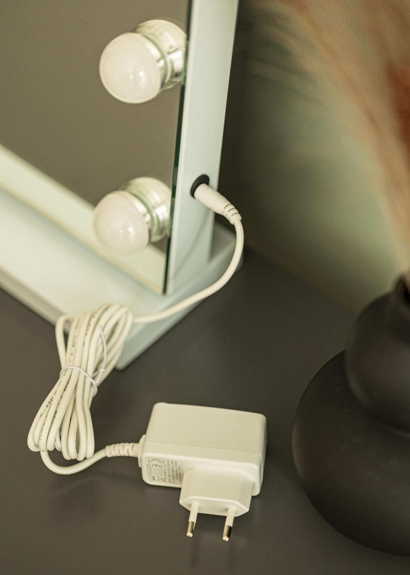 Le miroir peut être accroché au mur en position horizontale ou posé fermement sur le socle inclus. Ce modèle a un socle blanc épuré qui accentue d'autant plus l'élégance de l'ensemble du miroir. Le raccordement électrique s'effectue avec une prise.